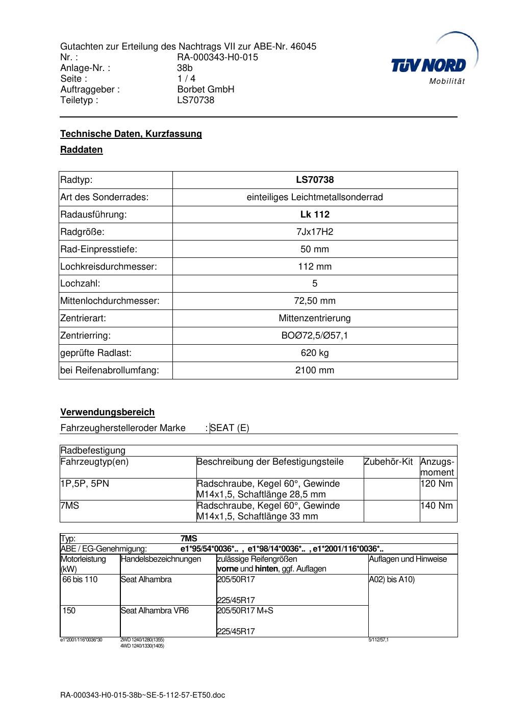Dieses Gutachten (abe) bezieht sich auf die Alufelge Borbet LS70738 in der Ausführung 7Jx17 ET 0, Mittenloch 0 mm (KBA 46045). Im PDF findest du typischerweise zulässige Reifengrößen, Auflagen/Anbauhinweise und – je nach Dokument – Hinweise zur Eintragung.