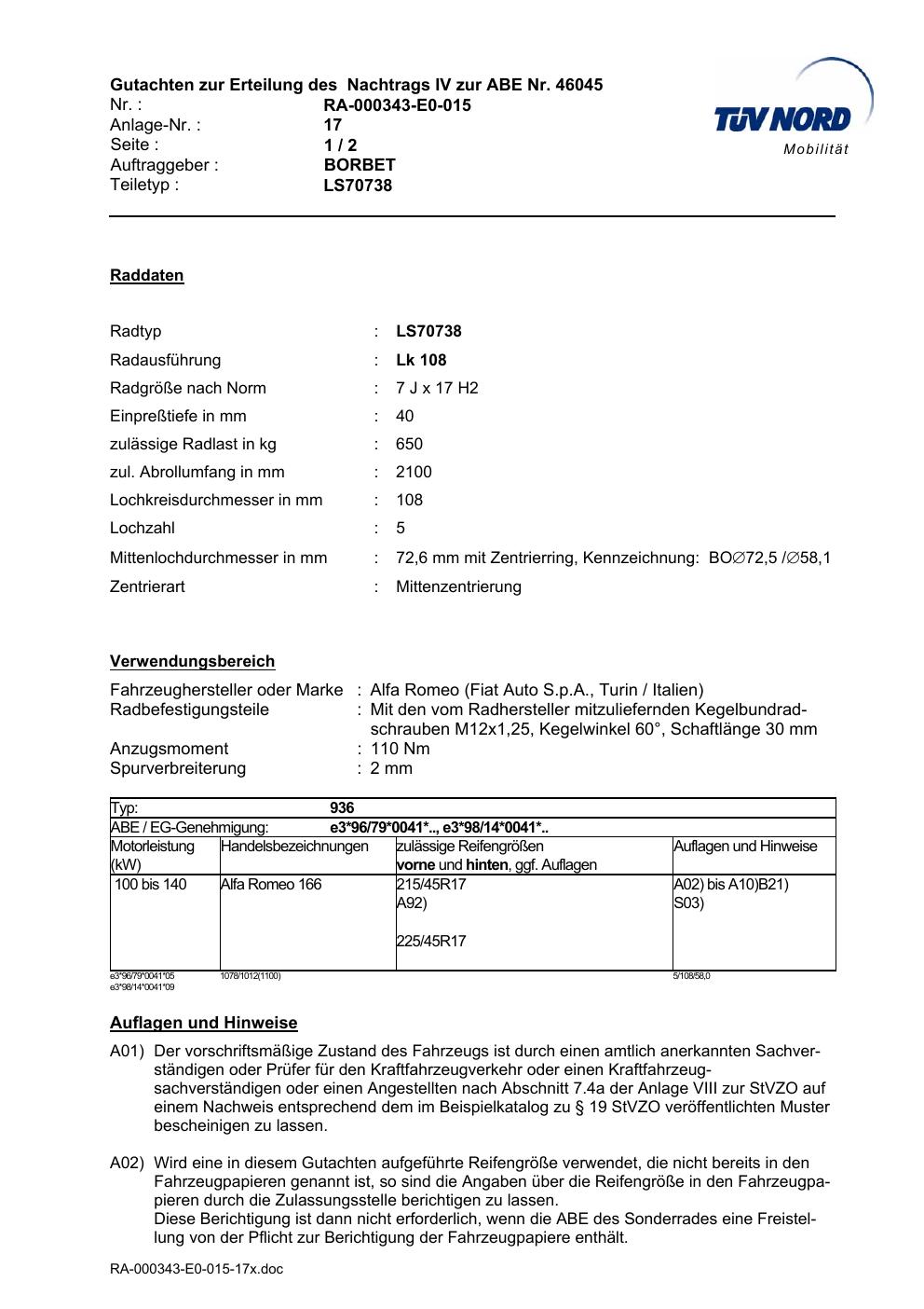 Dieses Gutachten (abe) bezieht sich auf die Alufelge Borbet LS70738 in der Ausführung 7Jx17 ET 0, Mittenloch 0 mm (KBA 46045). Im PDF findest du typischerweise zulässige Reifengrößen, Auflagen/Anbauhinweise und – je nach Dokument – Hinweise zur Eintragung.