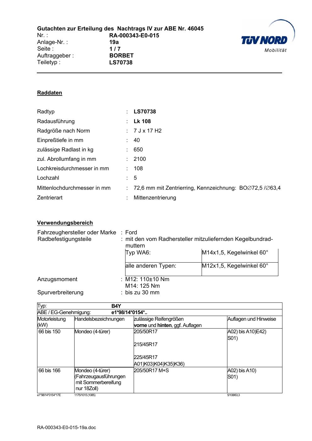 Dieses Gutachten (abe) bezieht sich auf die Alufelge Borbet LS70738 in der Ausführung 7Jx17 ET 0, Mittenloch 0 mm (KBA 46045). Im PDF findest du typischerweise zulässige Reifengrößen, Auflagen/Anbauhinweise und – je nach Dokument – Hinweise zur Eintragung.