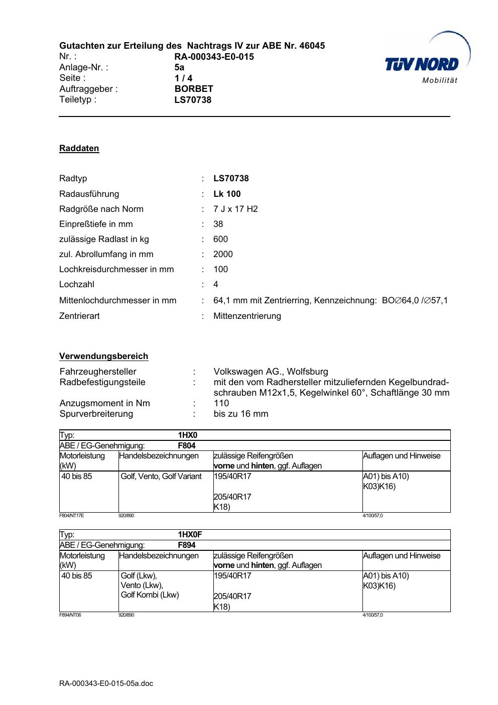 Dieses Gutachten (abe) bezieht sich auf die Alufelge Borbet LS70738 in der Ausführung 7Jx17 ET 0, Mittenloch 0 mm (KBA 46045). Im PDF findest du typischerweise zulässige Reifengrößen, Auflagen/Anbauhinweise und – je nach Dokument – Hinweise zur Eintragung.