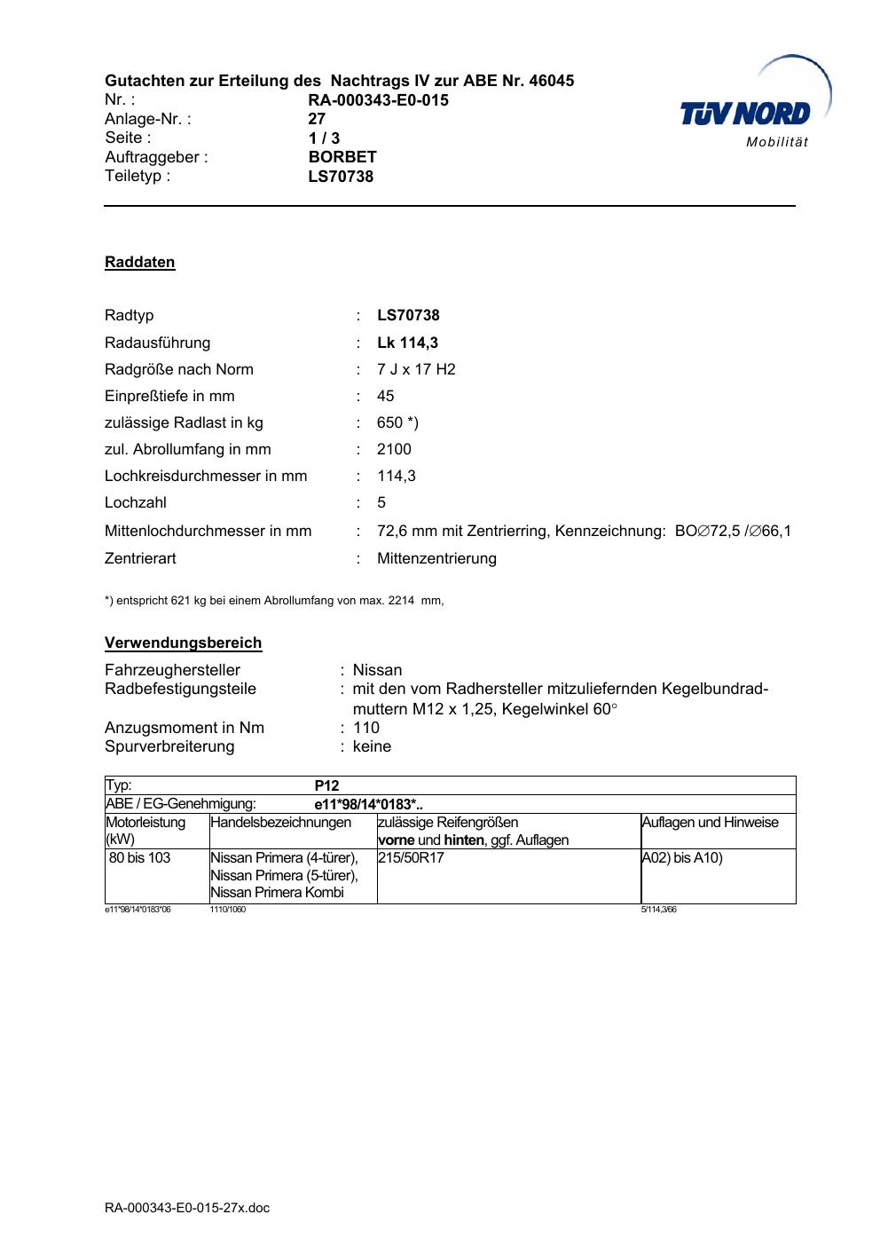 Dieses Gutachten (abe) bezieht sich auf die Alufelge Borbet LS70738 in der Ausführung 7Jx17 ET 0, Mittenloch 0 mm (KBA 46045). Im PDF findest du typischerweise zulässige Reifengrößen, Auflagen/Anbauhinweise und – je nach Dokument – Hinweise zur Eintragung.