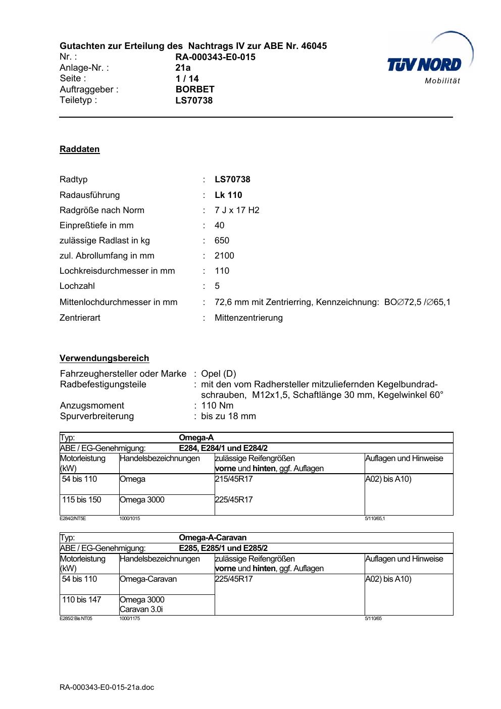 Dieses Gutachten (abe) bezieht sich auf die Alufelge Borbet LS70738 in der Ausführung 7Jx17 ET 0, Mittenloch 0 mm (KBA 46045). Im PDF findest du typischerweise zulässige Reifengrößen, Auflagen/Anbauhinweise und – je nach Dokument – Hinweise zur Eintragung.