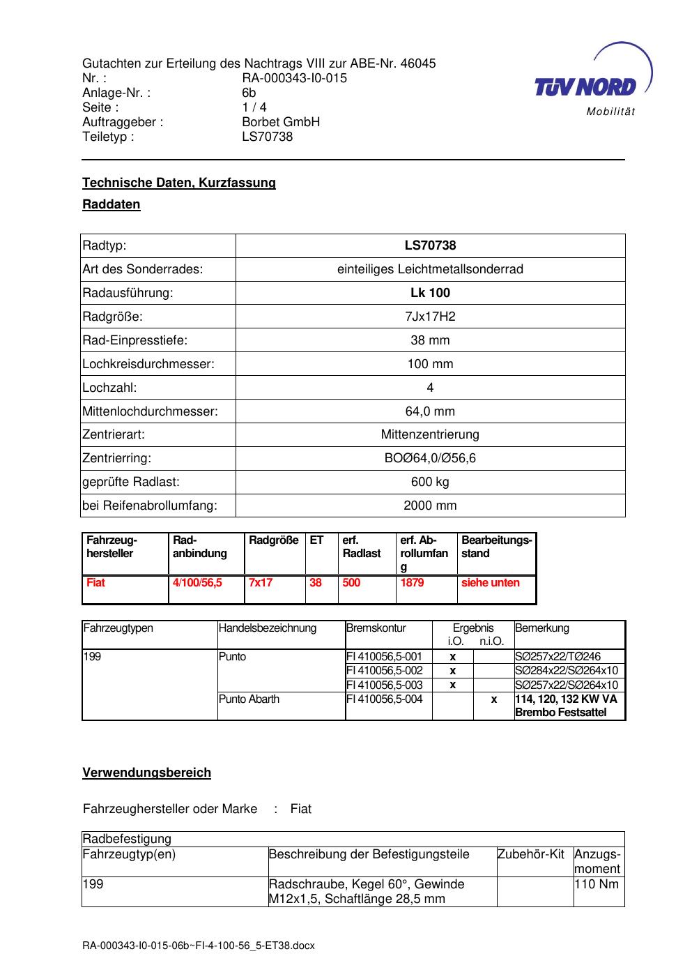 Dieses Gutachten (abe) bezieht sich auf die Alufelge Borbet LS70738 in der Ausführung 7Jx17 ET 0, Mittenloch 0 mm (KBA 46045). Im PDF findest du typischerweise zulässige Reifengrößen, Auflagen/Anbauhinweise und – je nach Dokument – Hinweise zur Eintragung.