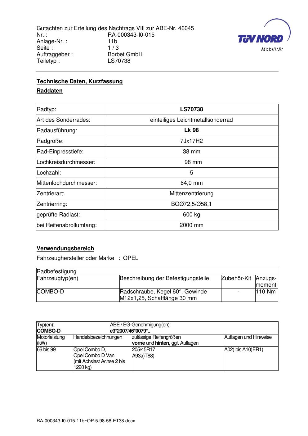 Dieses Gutachten (abe) bezieht sich auf die Alufelge Borbet LS70738 in der Ausführung 7Jx17 ET 0, Mittenloch 0 mm (KBA 46045). Im PDF findest du typischerweise zulässige Reifengrößen, Auflagen/Anbauhinweise und – je nach Dokument – Hinweise zur Eintragung.