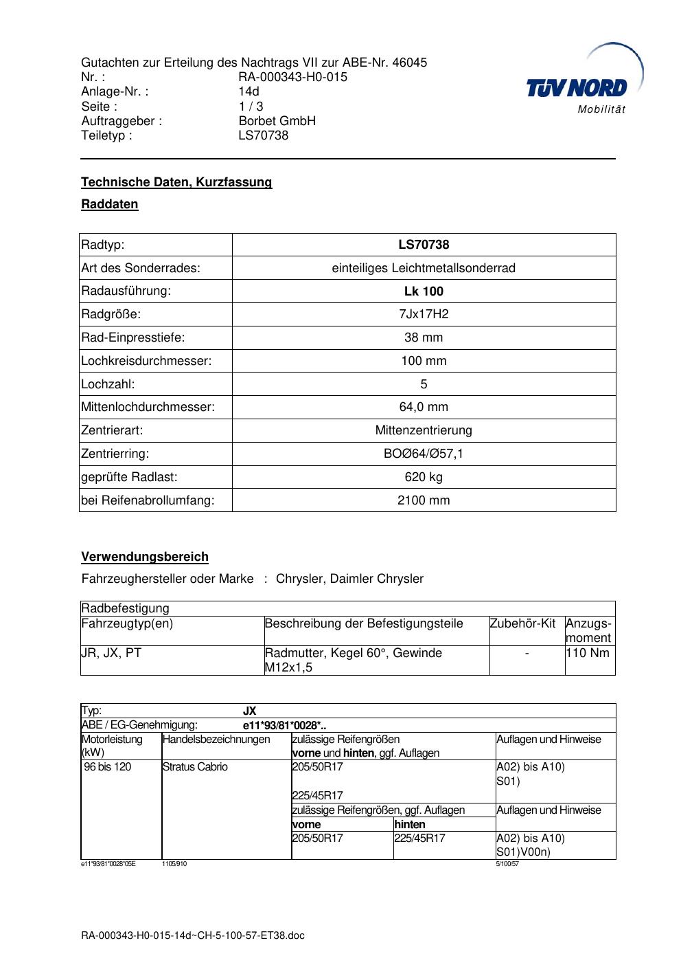 Dieses Gutachten (abe) bezieht sich auf die Alufelge Borbet LS70738 in der Ausführung 7Jx17 ET 0, Mittenloch 0 mm (KBA 46045). Im PDF findest du typischerweise zulässige Reifengrößen, Auflagen/Anbauhinweise und – je nach Dokument – Hinweise zur Eintragung.