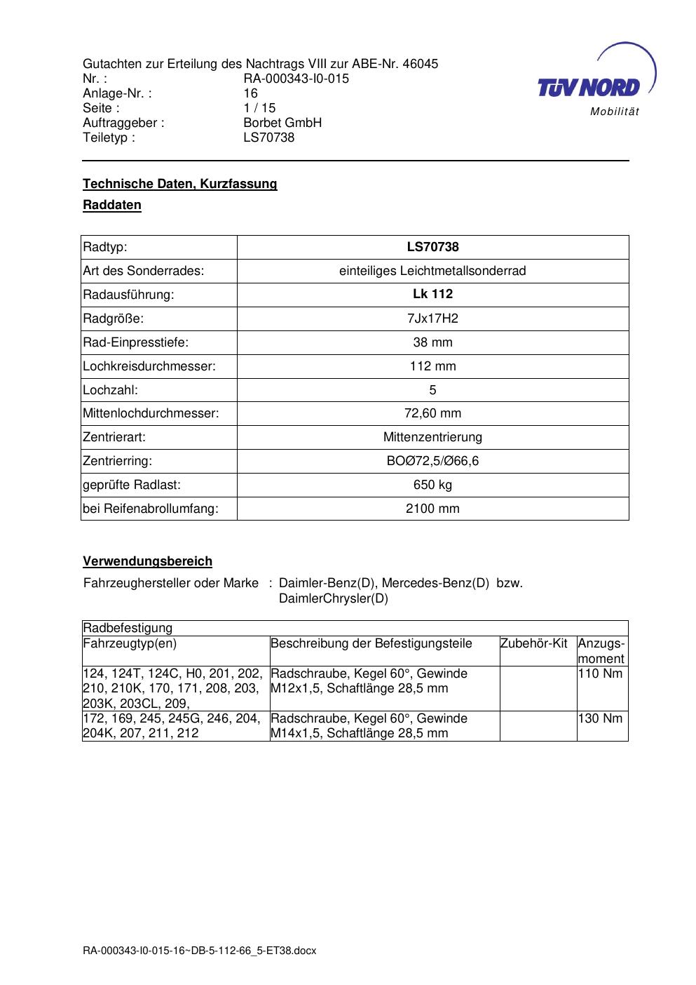 Dieses Gutachten (abe) bezieht sich auf die Alufelge Borbet LS70738 in der Ausführung 7Jx17 ET 0, Mittenloch 0 mm (KBA 46045). Im PDF findest du typischerweise zulässige Reifengrößen, Auflagen/Anbauhinweise und – je nach Dokument – Hinweise zur Eintragung.