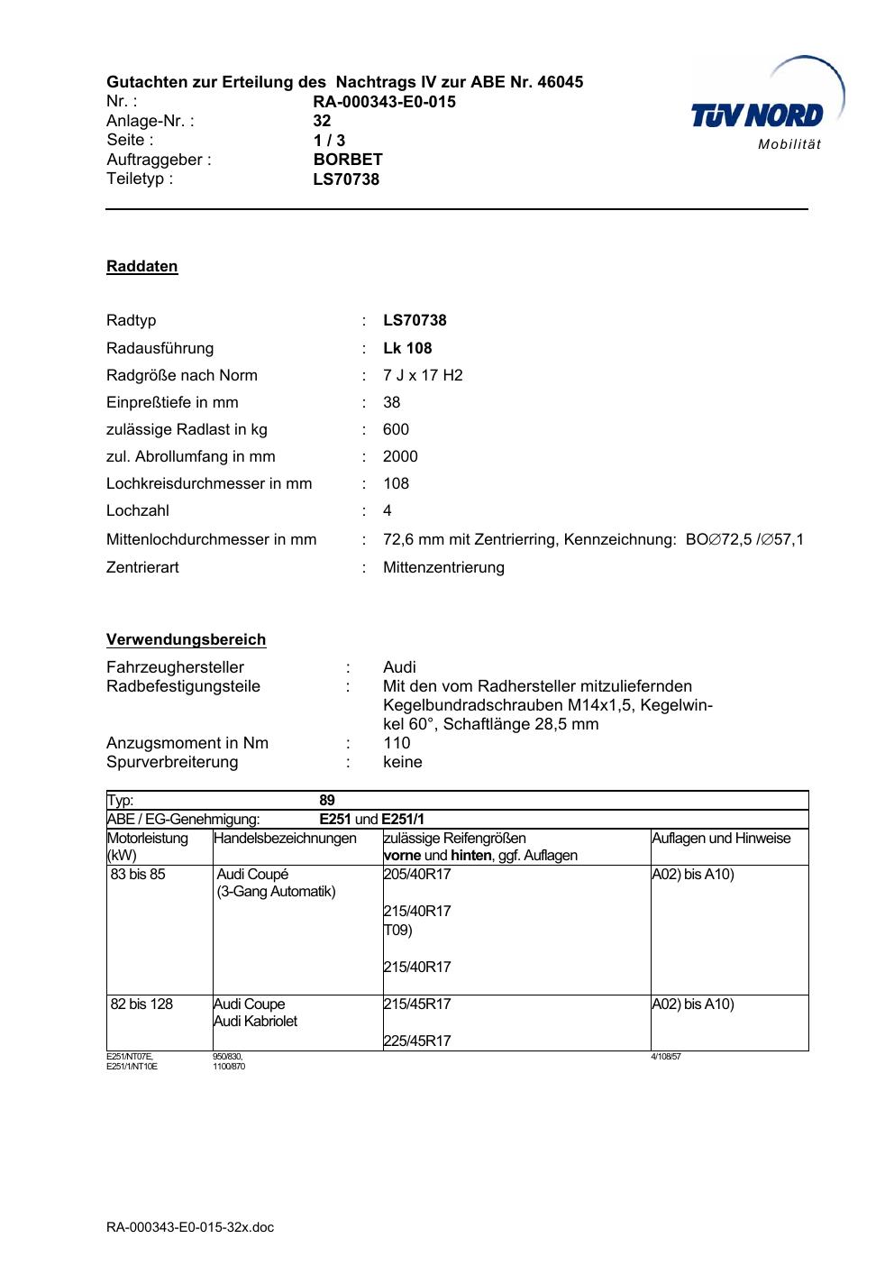 Dieses Gutachten (abe) bezieht sich auf die Alufelge Borbet LS70738 in der Ausführung 7Jx17 ET 0, Mittenloch 0 mm (KBA 46045). Im PDF findest du typischerweise zulässige Reifengrößen, Auflagen/Anbauhinweise und – je nach Dokument – Hinweise zur Eintragung.