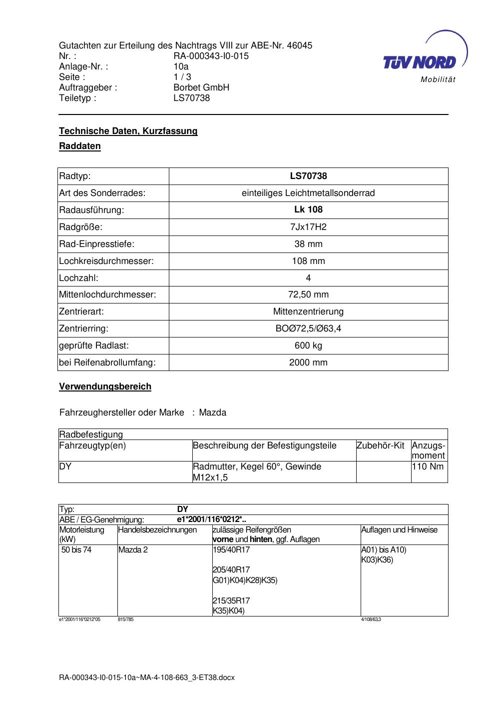 Dieses Gutachten (abe) bezieht sich auf die Alufelge Borbet LS70738 in der Ausführung 7Jx17 ET 0, Mittenloch 0 mm (KBA 46045). Im PDF findest du typischerweise zulässige Reifengrößen, Auflagen/Anbauhinweise und – je nach Dokument – Hinweise zur Eintragung.