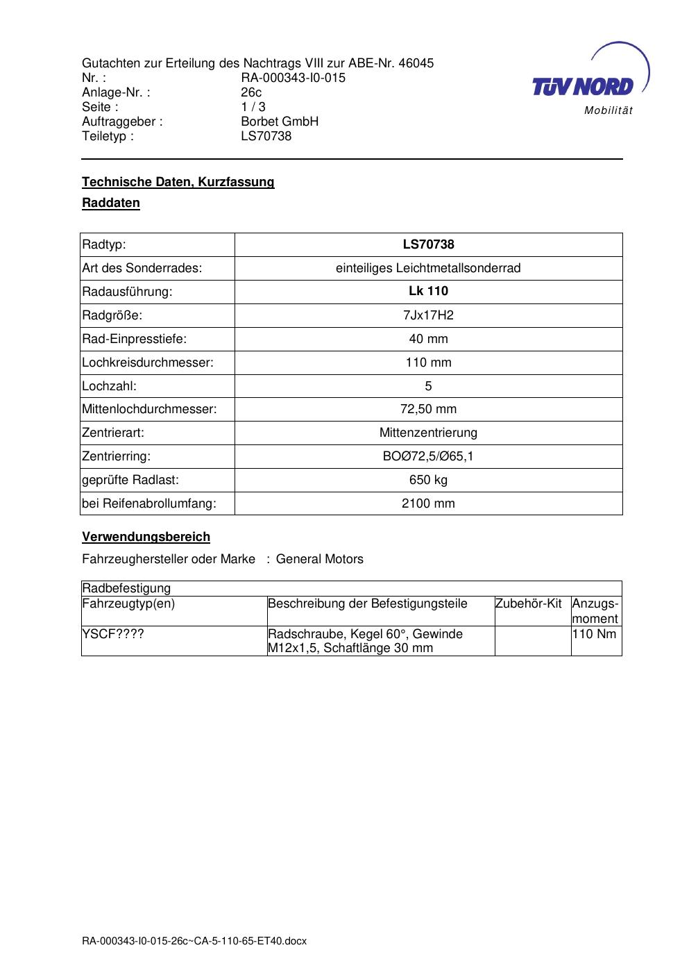Dieses Gutachten (abe) bezieht sich auf die Alufelge Borbet LS70738 in der Ausführung 7Jx17 ET 0, Mittenloch 0 mm (KBA 46045). Im PDF findest du typischerweise zulässige Reifengrößen, Auflagen/Anbauhinweise und – je nach Dokument – Hinweise zur Eintragung.