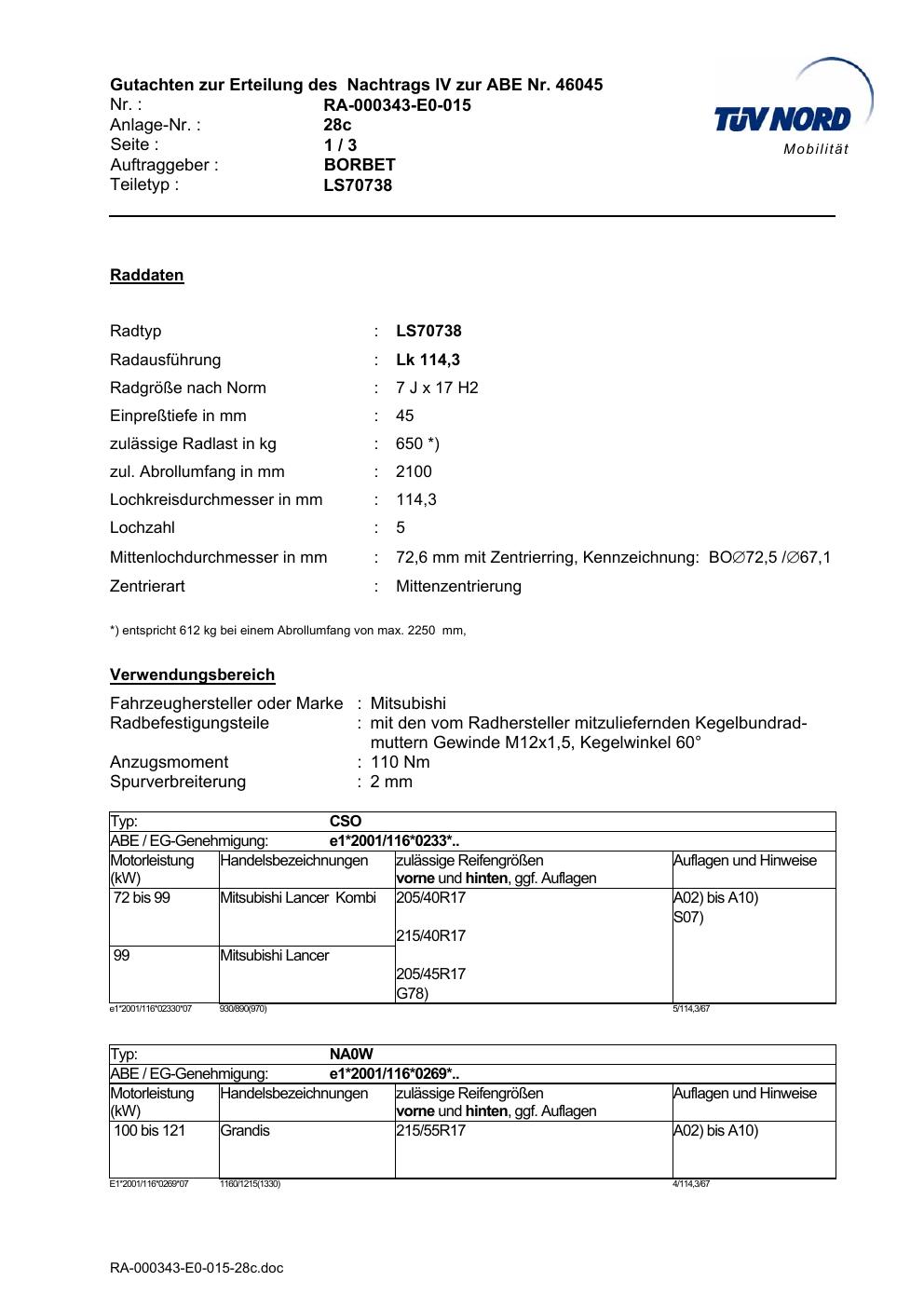 Dieses Gutachten (abe) bezieht sich auf die Alufelge Borbet LS70738 in der Ausführung 7Jx17 ET 0, Mittenloch 0 mm (KBA 46045). Im PDF findest du typischerweise zulässige Reifengrößen, Auflagen/Anbauhinweise und – je nach Dokument – Hinweise zur Eintragung.