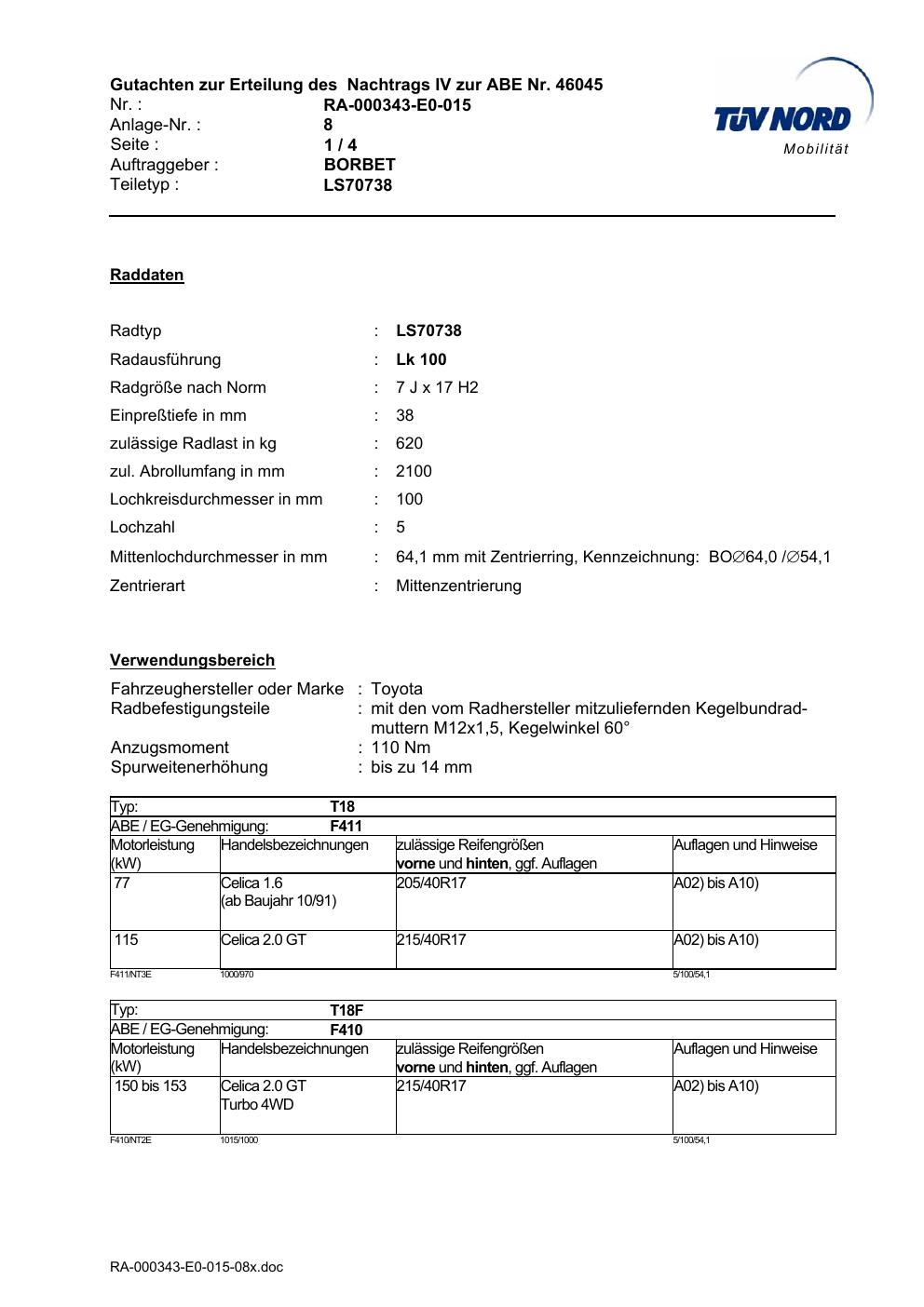 Dieses Gutachten (abe) bezieht sich auf die Alufelge Borbet LS70738 in der Ausführung 7Jx17 ET 0, Mittenloch 0 mm (KBA 46045). Im PDF findest du typischerweise zulässige Reifengrößen, Auflagen/Anbauhinweise und – je nach Dokument – Hinweise zur Eintragung.