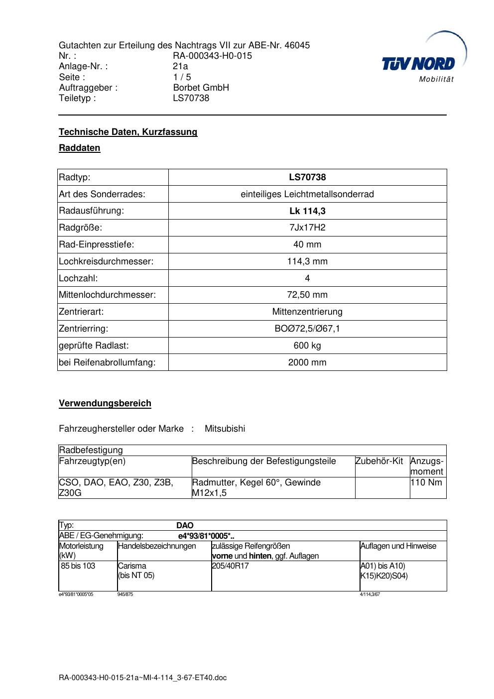 Dieses Gutachten (abe) bezieht sich auf die Alufelge Borbet LS70738 in der Ausführung 7Jx17 ET 0, Mittenloch 0 mm (KBA 46045). Im PDF findest du typischerweise zulässige Reifengrößen, Auflagen/Anbauhinweise und – je nach Dokument – Hinweise zur Eintragung.