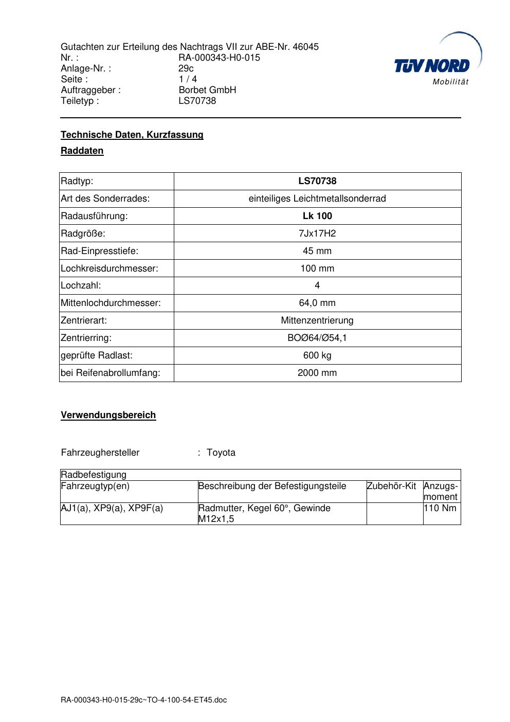Dieses Gutachten (abe) bezieht sich auf die Alufelge Borbet LS70738 in der Ausführung 7Jx17 ET 0, Mittenloch 0 mm (KBA 46045). Im PDF findest du typischerweise zulässige Reifengrößen, Auflagen/Anbauhinweise und – je nach Dokument – Hinweise zur Eintragung.