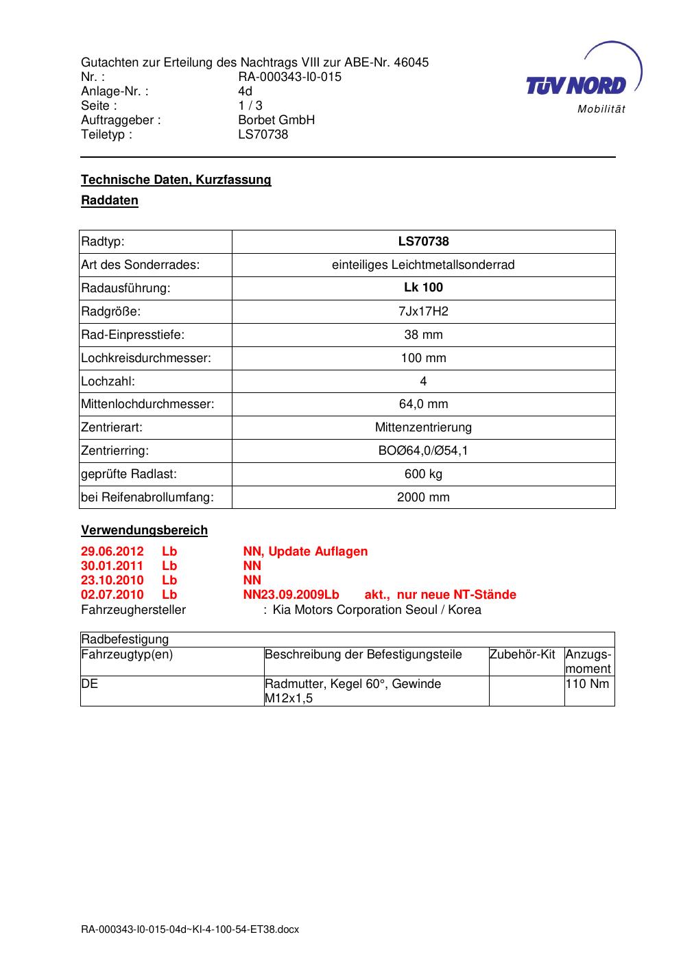 Felgengutachten / abe für Alufelgen Borbet LS70738 (7Jx17 ET 0, Mittenloch 0 mm) mit KBA 46045 (Zertifikatsnummer 46045). Hier kostenlos als PDF herunterladen. Der Download-Link ist 24 Stunden gültig und kann bis zu zwei Mal verwendet werden.