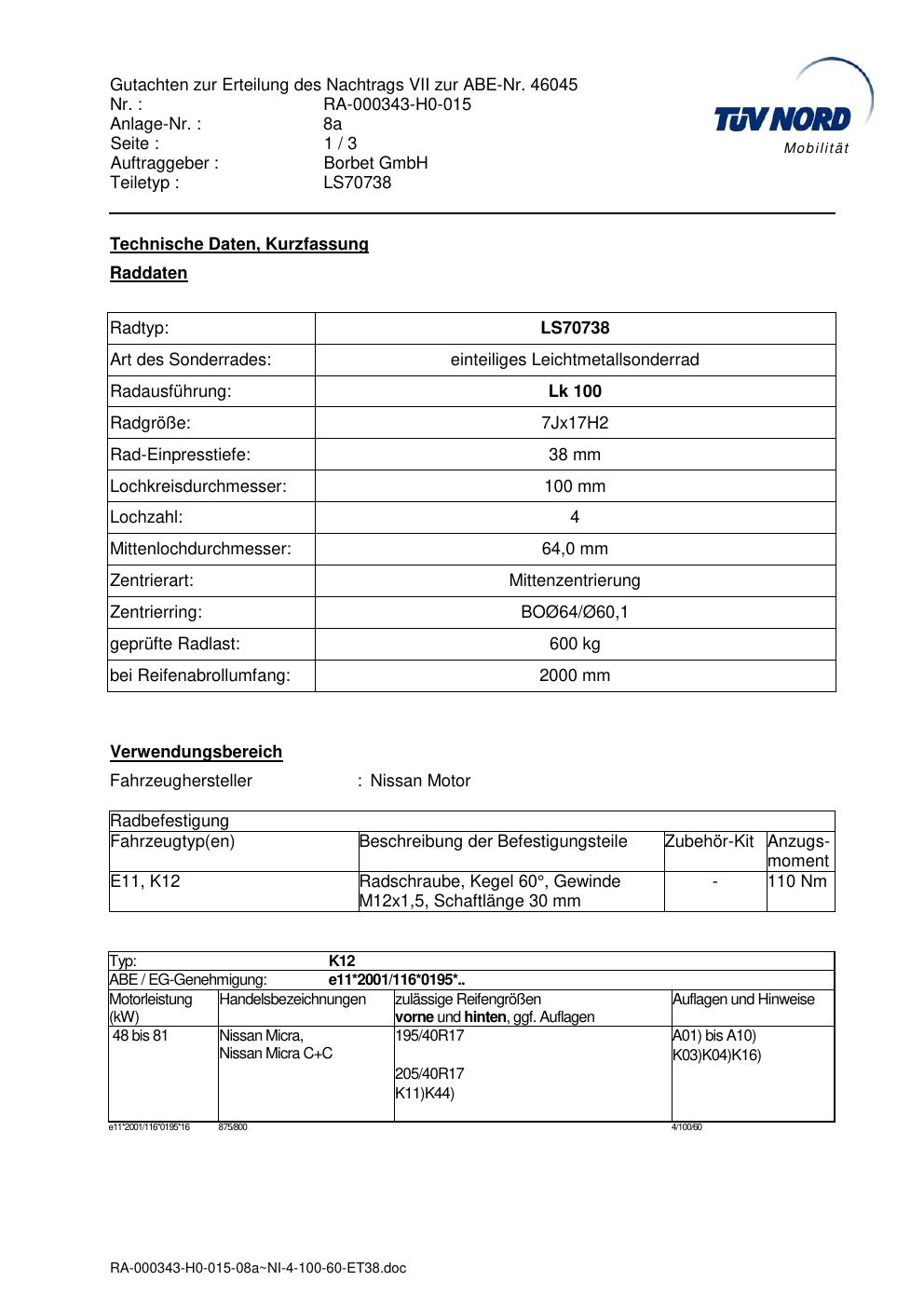 Dieses Gutachten (abe) bezieht sich auf die Alufelge Borbet LS70738 in der Ausführung 7Jx17 ET 0, Mittenloch 0 mm (KBA 46045). Im PDF findest du typischerweise zulässige Reifengrößen, Auflagen/Anbauhinweise und – je nach Dokument – Hinweise zur Eintragung.