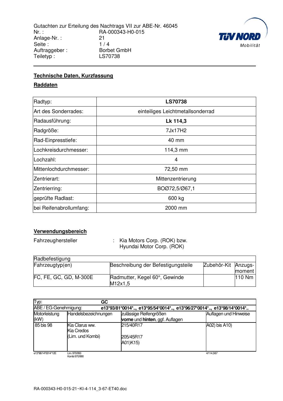 Dieses Gutachten (abe) bezieht sich auf die Alufelge Borbet LS70738 in der Ausführung 7Jx17 ET 0, Mittenloch 0 mm (KBA 46045). Im PDF findest du typischerweise zulässige Reifengrößen, Auflagen/Anbauhinweise und – je nach Dokument – Hinweise zur Eintragung.