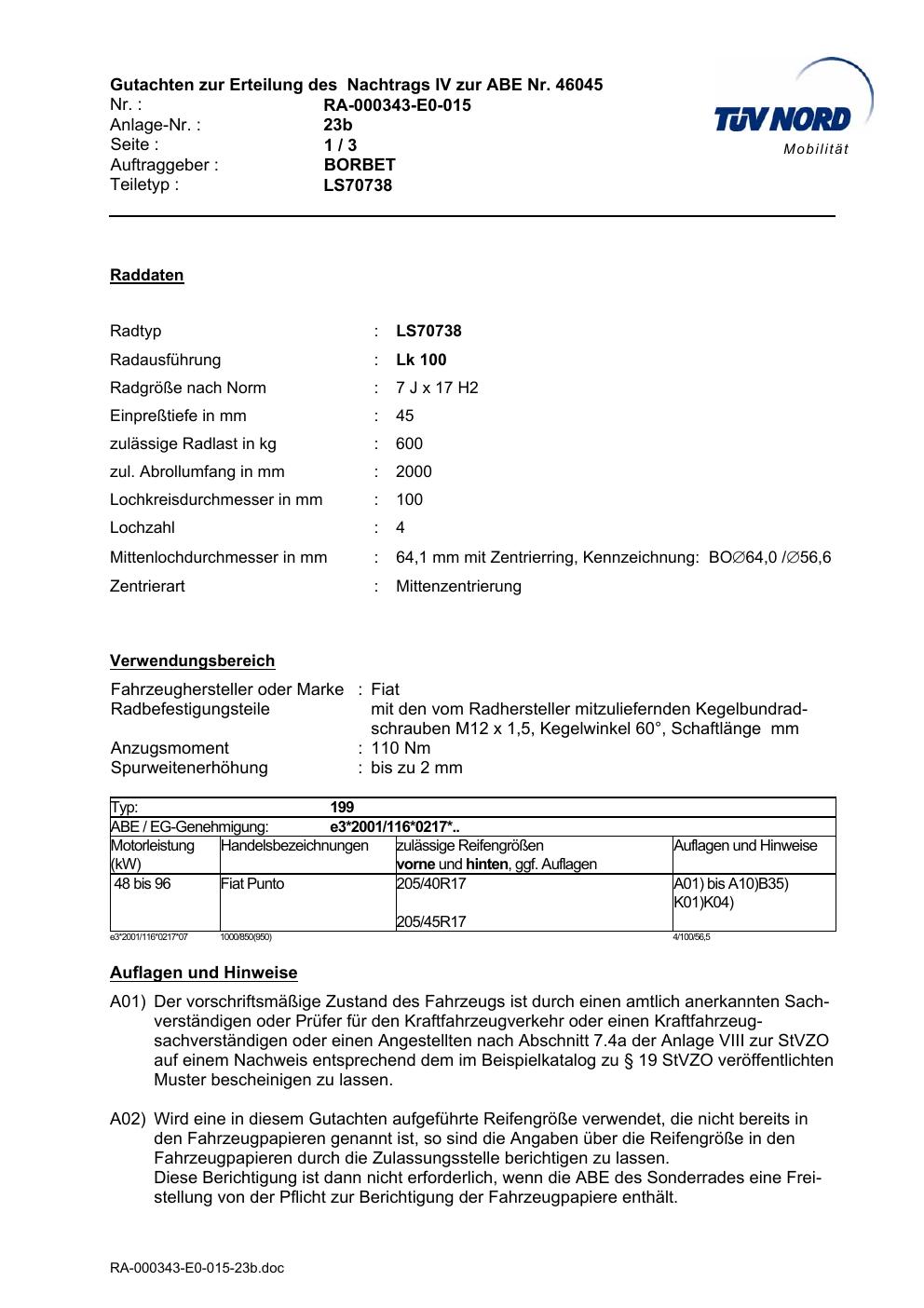 Dieses Gutachten (abe) bezieht sich auf die Alufelge Borbet LS70738 in der Ausführung 7Jx17 ET 0, Mittenloch 0 mm (KBA 46045). Im PDF findest du typischerweise zulässige Reifengrößen, Auflagen/Anbauhinweise und – je nach Dokument – Hinweise zur Eintragung.