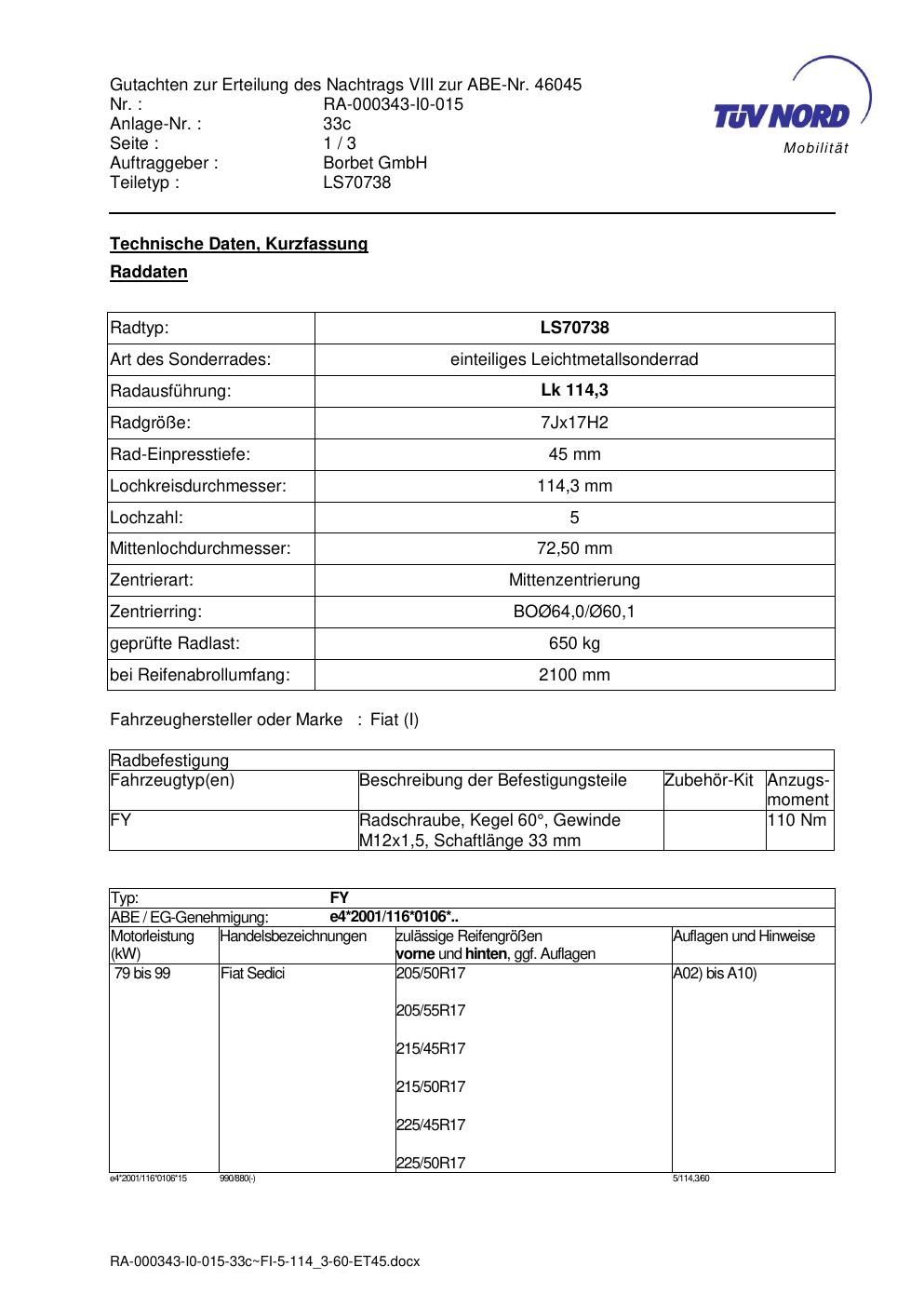 Dieses Gutachten (abe) bezieht sich auf die Alufelge Borbet LS70738 in der Ausführung 7Jx17 ET 0, Mittenloch 0 mm (KBA 46045). Im PDF findest du typischerweise zulässige Reifengrößen, Auflagen/Anbauhinweise und – je nach Dokument – Hinweise zur Eintragung.