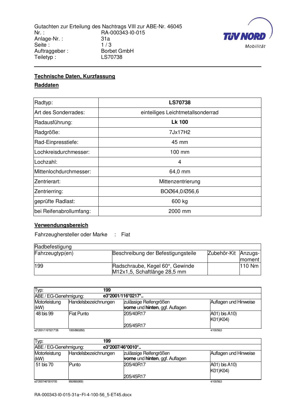 Dieses Gutachten (abe) bezieht sich auf die Alufelge Borbet LS70738 in der Ausführung 7Jx17 ET 0, Mittenloch 0 mm (KBA 46045). Im PDF findest du typischerweise zulässige Reifengrößen, Auflagen/Anbauhinweise und – je nach Dokument – Hinweise zur Eintragung.