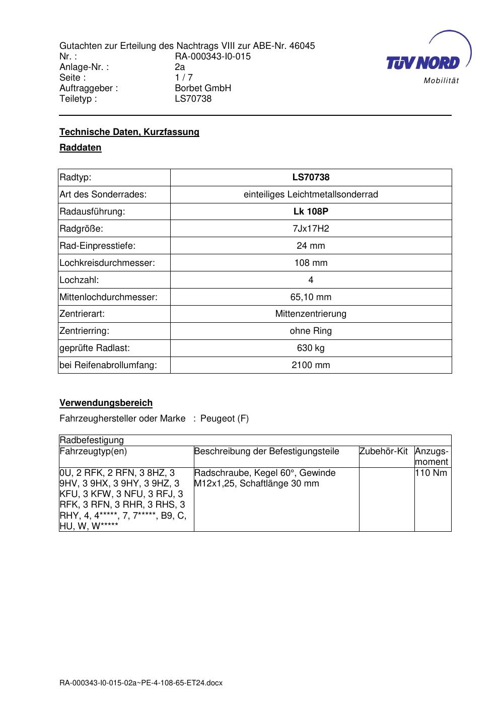 Dieses Gutachten (abe) bezieht sich auf die Alufelge Borbet LS70738 in der Ausführung 7Jx17 ET 0, Mittenloch 0 mm (KBA 46045). Im PDF findest du typischerweise zulässige Reifengrößen, Auflagen/Anbauhinweise und – je nach Dokument – Hinweise zur Eintragung.