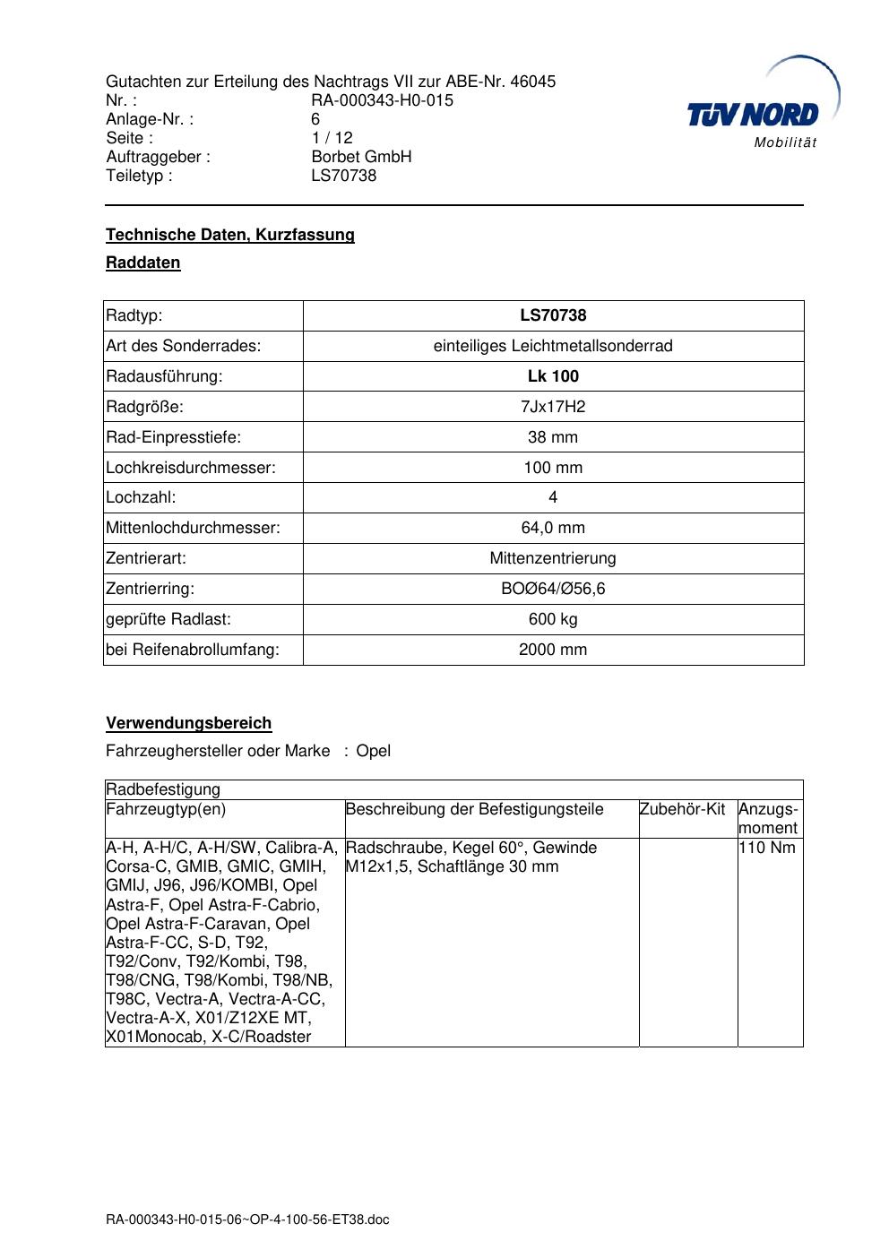 Dieses Gutachten (abe) bezieht sich auf die Alufelge Borbet LS70738 in der Ausführung 7Jx17 ET 0, Mittenloch 0 mm (KBA 46045). Im PDF findest du typischerweise zulässige Reifengrößen, Auflagen/Anbauhinweise und – je nach Dokument – Hinweise zur Eintragung.