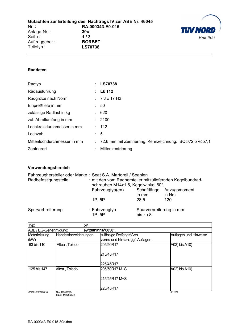 Dieses Gutachten (abe) bezieht sich auf die Alufelge Borbet LS70738 in der Ausführung 7Jx17 ET 0, Mittenloch 0 mm (KBA 46045). Im PDF findest du typischerweise zulässige Reifengrößen, Auflagen/Anbauhinweise und – je nach Dokument – Hinweise zur Eintragung.