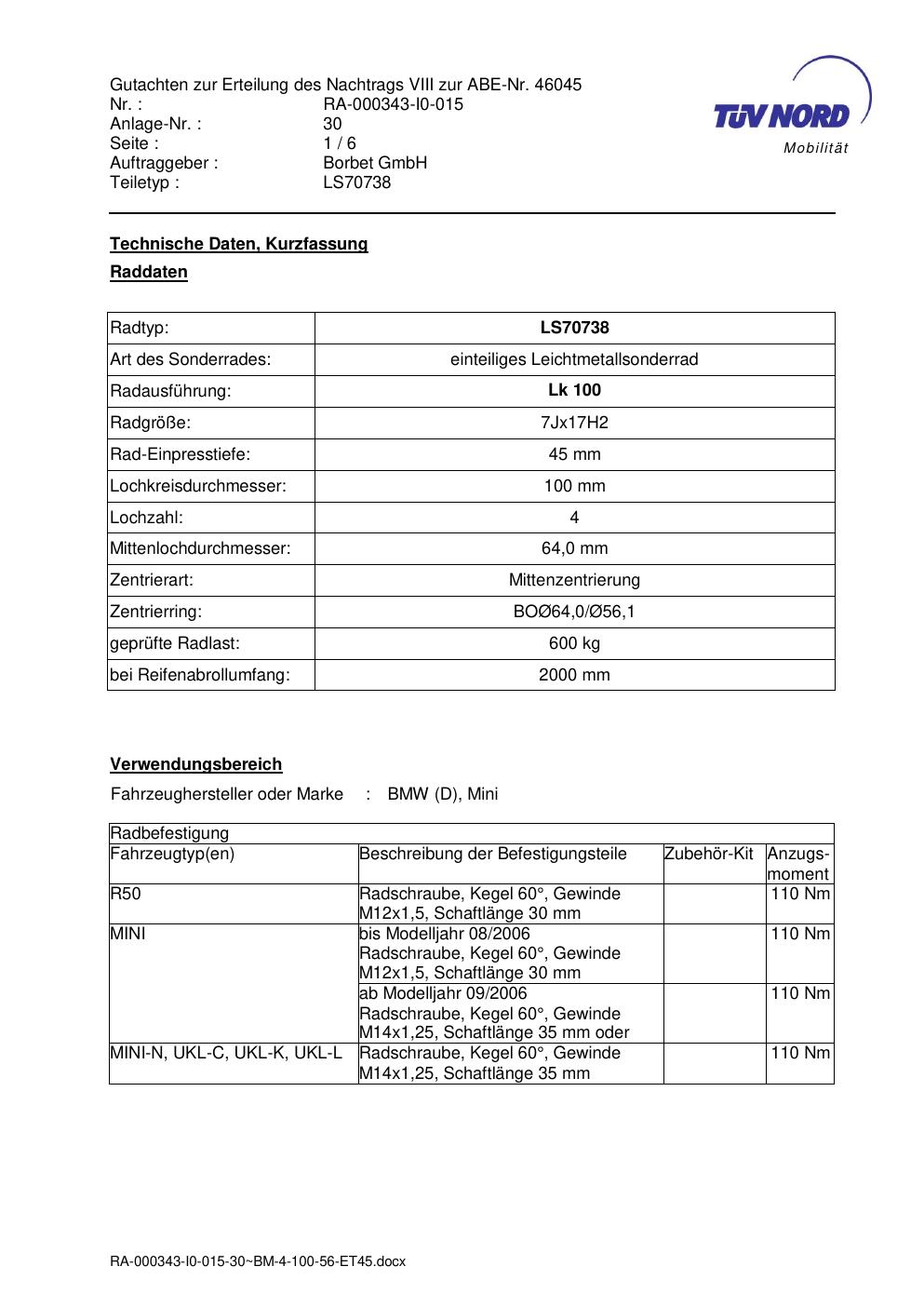 Dieses Gutachten (abe) bezieht sich auf die Alufelge Borbet LS70738 in der Ausführung 7Jx17 ET 0, Mittenloch 0 mm (KBA 46045). Im PDF findest du typischerweise zulässige Reifengrößen, Auflagen/Anbauhinweise und – je nach Dokument – Hinweise zur Eintragung.