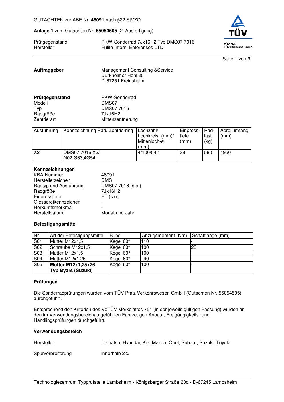 Felgengutachten / abe für Alufelgen ATS DMS07 7016 (7Jx16 ET 0, Mittenloch 0 mm) mit KBA 46091 (Zertifikatsnummer 46091). Hier kostenlos als PDF herunterladen. Der Download-Link ist 24 Stunden gültig und kann bis zu zwei Mal verwendet werden.
