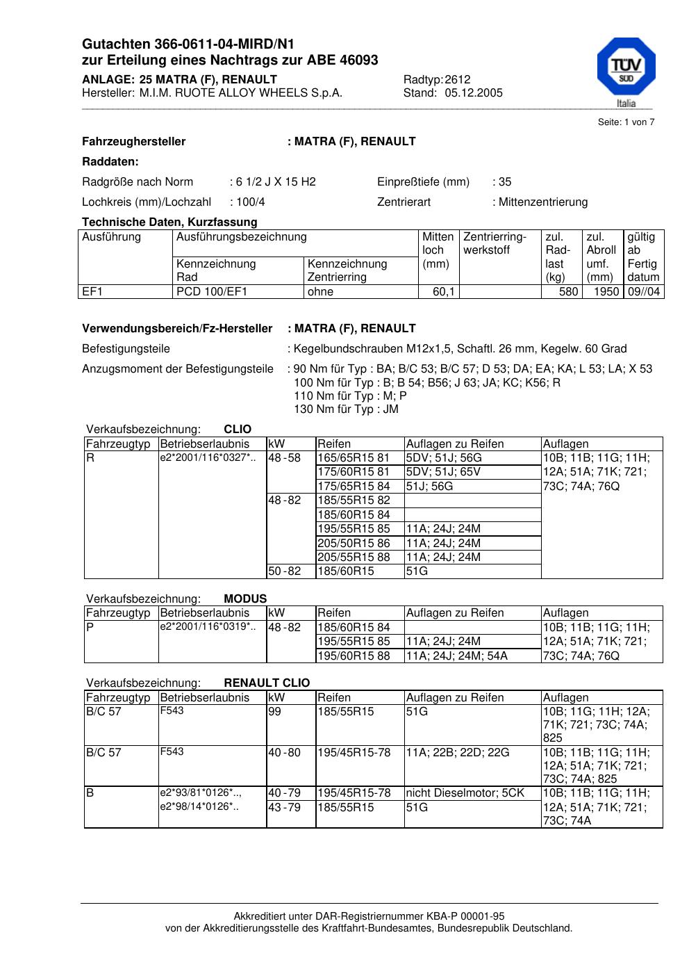 Dieses Gutachten (abe) bezieht sich auf die Alufelge ATS 2612 in der Ausführung 2Jx15 ET 0, Mittenloch 0 mm (KBA 46093). Im PDF findest du typischerweise zulässige Reifengrößen, Auflagen/Anbauhinweise und – je nach Dokument – Hinweise zur Eintragung.