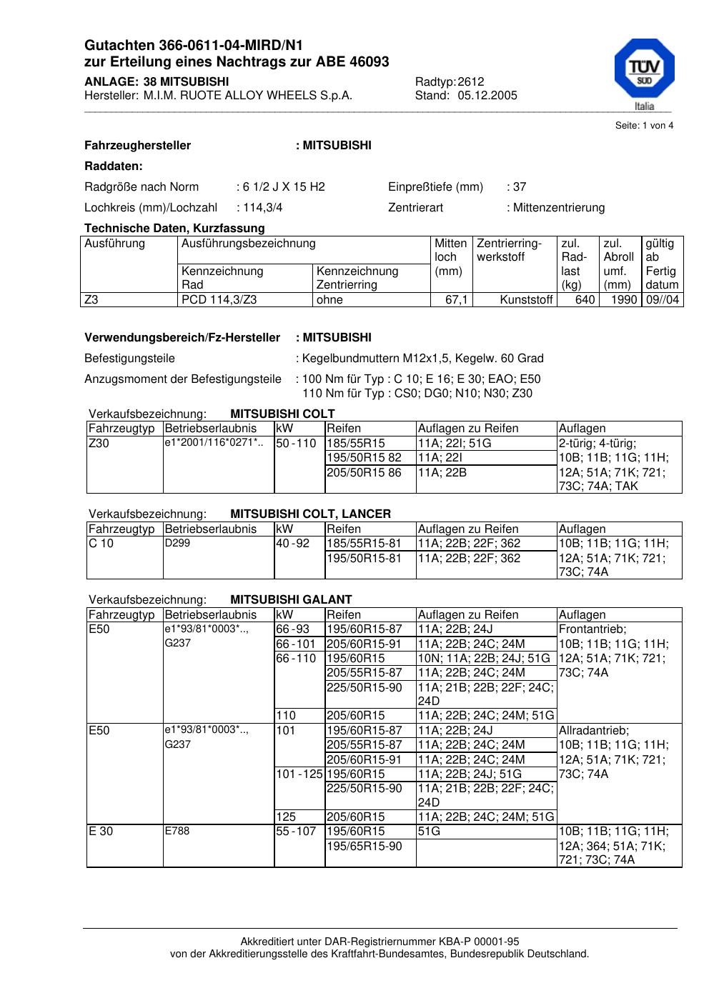 Dieses Gutachten (abe) bezieht sich auf die Alufelge ATS 2612 in der Ausführung 2Jx15 ET 0, Mittenloch 0 mm (KBA 46093). Im PDF findest du typischerweise zulässige Reifengrößen, Auflagen/Anbauhinweise und – je nach Dokument – Hinweise zur Eintragung.