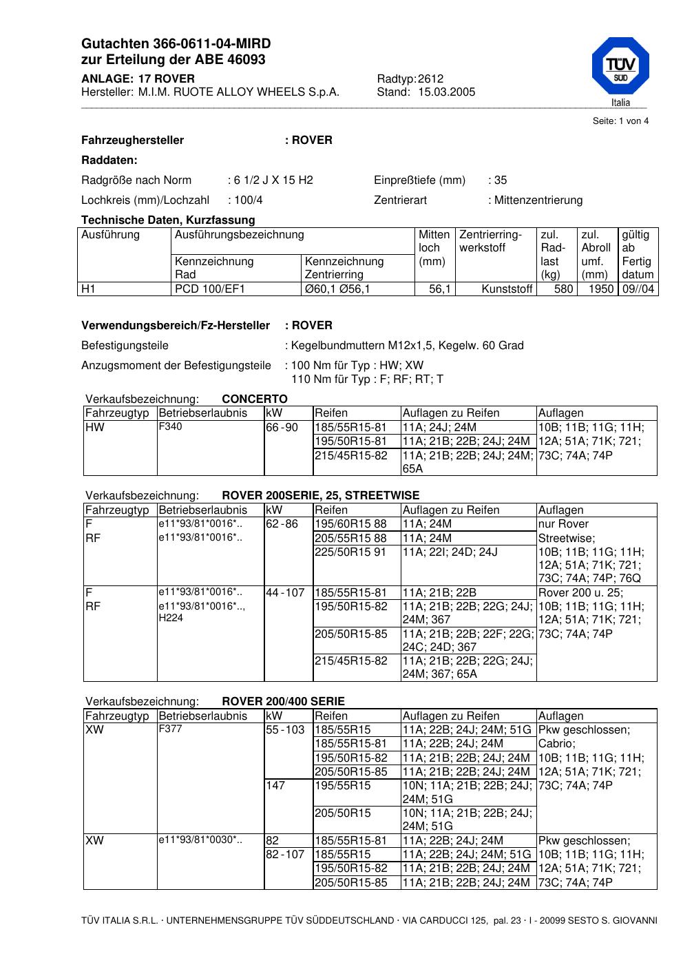 Dieses Gutachten (abe) bezieht sich auf die Alufelge ATS 2612 in der Ausführung 2Jx15 ET 0, Mittenloch 0 mm (KBA 46093). Im PDF findest du typischerweise zulässige Reifengrößen, Auflagen/Anbauhinweise und – je nach Dokument – Hinweise zur Eintragung.