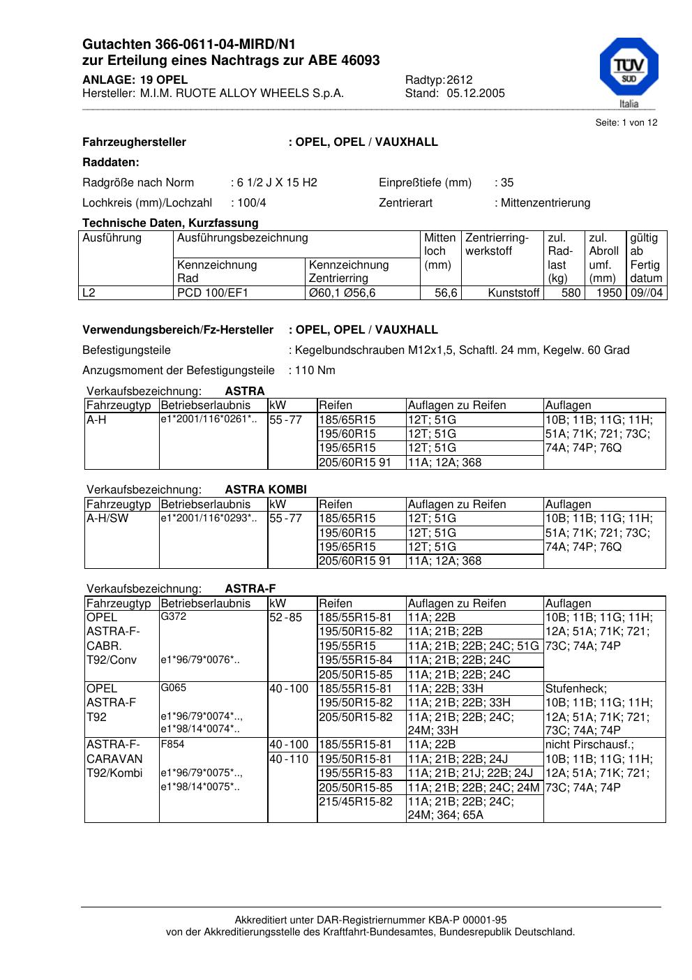 Dieses Gutachten (abe) bezieht sich auf die Alufelge ATS 2612 in der Ausführung 2Jx15 ET 0, Mittenloch 0 mm (KBA 46093). Im PDF findest du typischerweise zulässige Reifengrößen, Auflagen/Anbauhinweise und – je nach Dokument – Hinweise zur Eintragung.