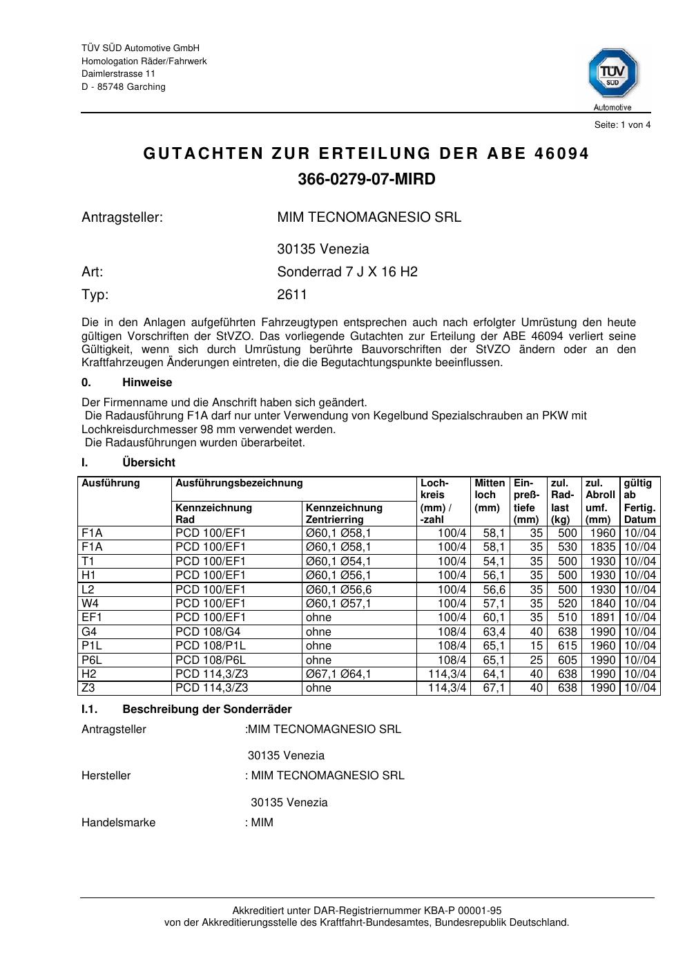 Dieses Gutachten (abe) bezieht sich auf die Alufelge ATS 2611 in der Ausführung 7Jx16 ET 0, Mittenloch 0 mm (KBA 46094). Im PDF findest du typischerweise zulässige Reifengrößen, Auflagen/Anbauhinweise und – je nach Dokument – Hinweise zur Eintragung.