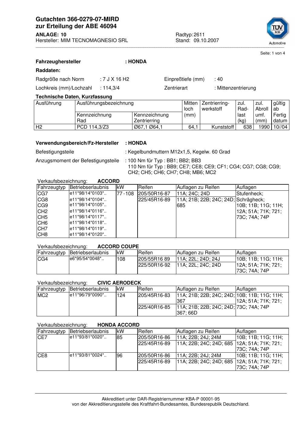 Dieses Gutachten (abe) bezieht sich auf die Alufelge ATS 2611 in der Ausführung 7Jx16 ET 0, Mittenloch 0 mm (KBA 46094). Im PDF findest du typischerweise zulässige Reifengrößen, Auflagen/Anbauhinweise und – je nach Dokument – Hinweise zur Eintragung.
