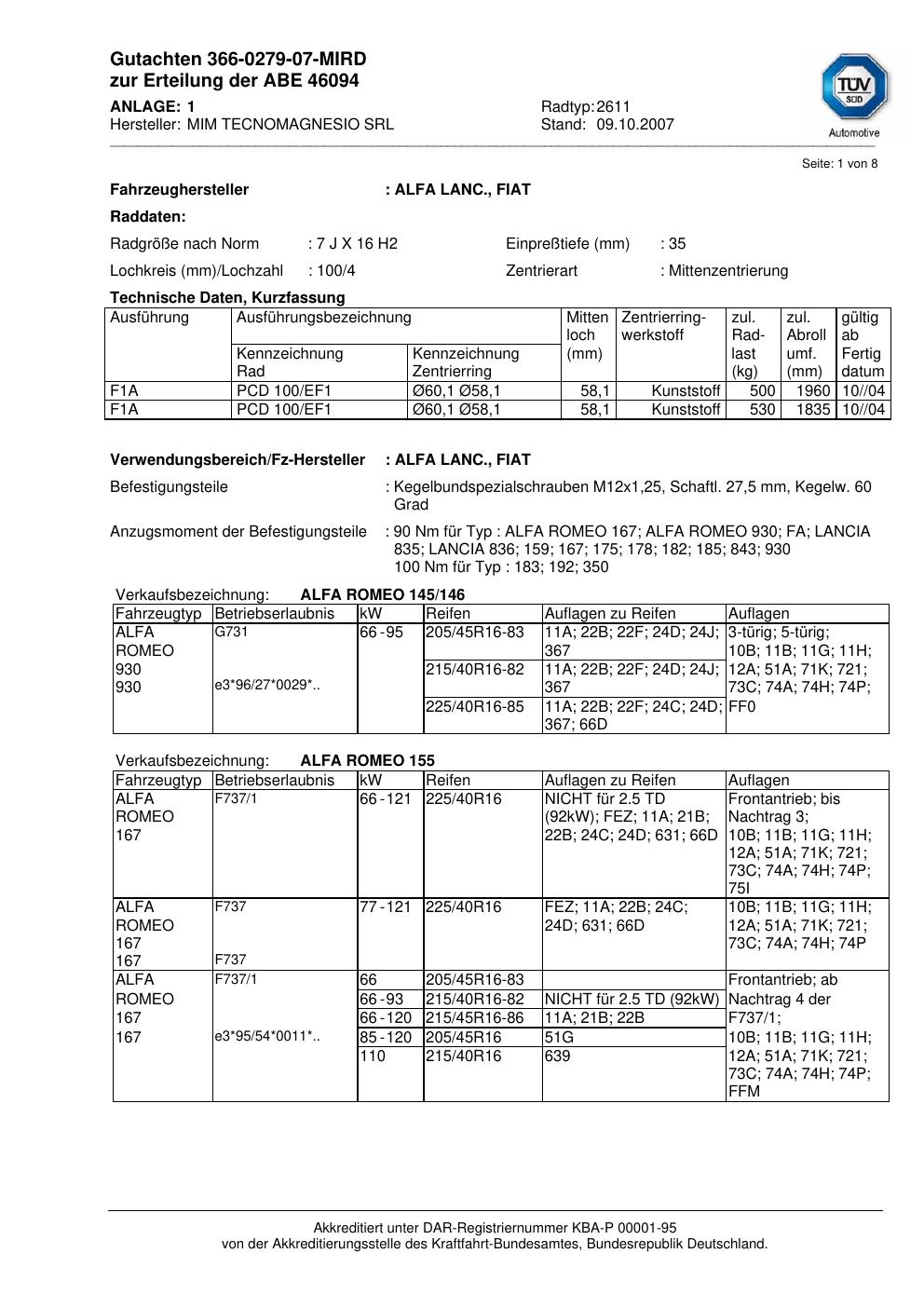 Felgengutachten / abe für Alufelgen ATS 2611 (7Jx16 ET 0, Mittenloch 0 mm) mit KBA 46094 (Zertifikatsnummer 46094). Hier kostenlos als PDF herunterladen. Der Download-Link ist 24 Stunden gültig und kann bis zu zwei Mal verwendet werden.