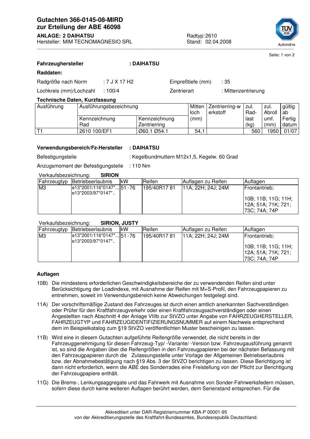 Dieses Gutachten (abe) bezieht sich auf die Alufelge ATS 2610 in der Ausführung 7Jx17 ET 0, Mittenloch 0 mm (KBA 46098). Im PDF findest du typischerweise zulässige Reifengrößen, Auflagen/Anbauhinweise und – je nach Dokument – Hinweise zur Eintragung.