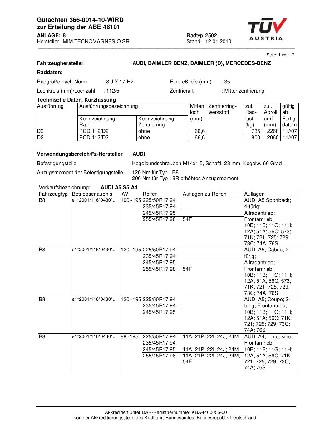 Dieses Gutachten (abe) bezieht sich auf die Alufelge ATS 2502 in der Ausführung 8Jx17 ET 0, Mittenloch 0 mm (KBA 46101). Im PDF findest du typischerweise zulässige Reifengrößen, Auflagen/Anbauhinweise und – je nach Dokument – Hinweise zur Eintragung.