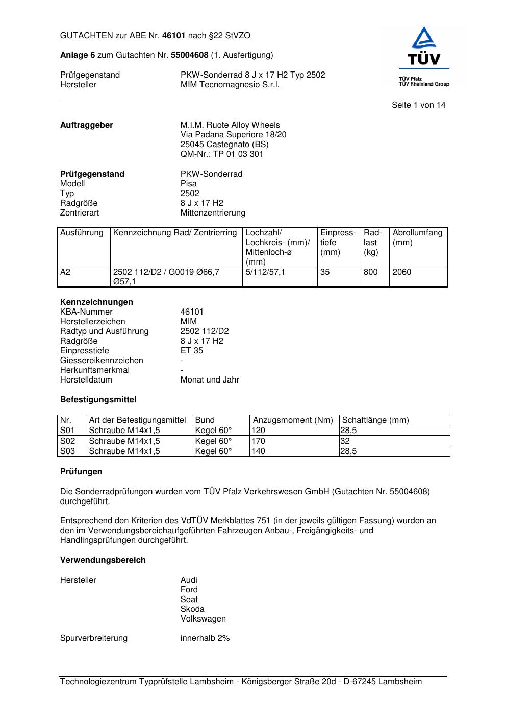 Dieses Gutachten (abe) bezieht sich auf die Alufelge ATS 2502 in der Ausführung 8Jx17 ET 0, Mittenloch 0 mm (KBA 46101). Im PDF findest du typischerweise zulässige Reifengrößen, Auflagen/Anbauhinweise und – je nach Dokument – Hinweise zur Eintragung.
