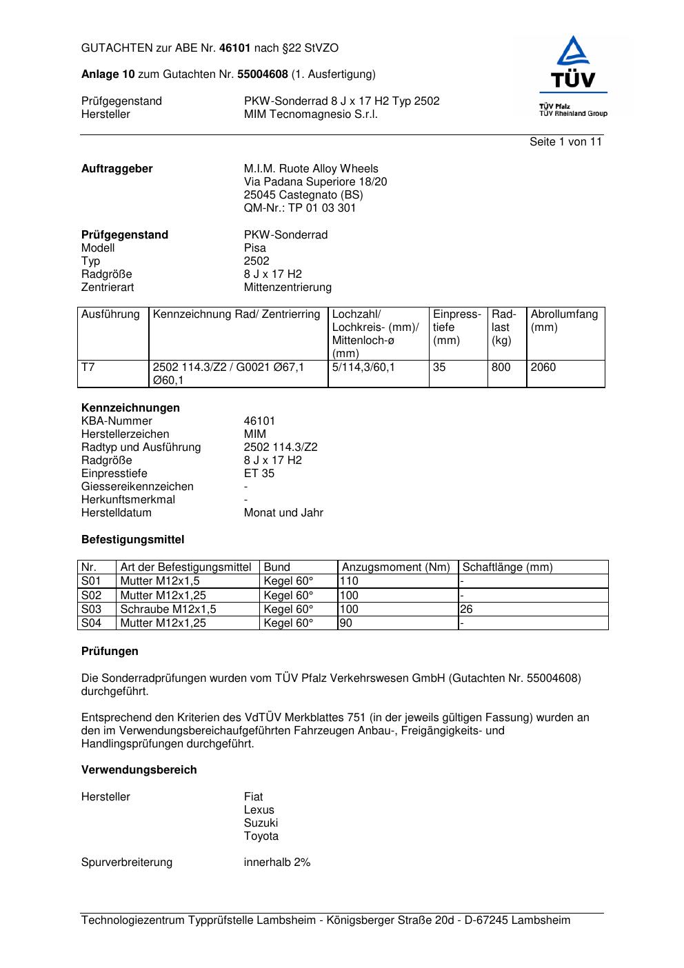 Dieses Gutachten (abe) bezieht sich auf die Alufelge Superior 2502 in der Ausführung 8Jx17 ET 0, Mittenloch 0 mm (KBA 46101). Im PDF findest du typischerweise zulässige Reifengrößen, Auflagen/Anbauhinweise und – je nach Dokument – Hinweise zur Eintragung.