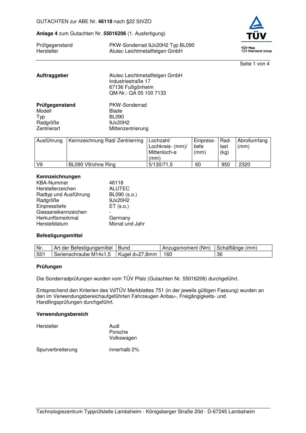 Dieses Gutachten (abe) bezieht sich auf die Alufelge ALUTEC BL090 Hersteller Alutec Leichtmetallfelge in der Ausführung 9Jx2 ET 0, Mittenloch 0 mm (KBA 46118). Im PDF findest du typischerweise zulässige Reifengrößen, Auflagen/Anbauhinweise und – je nach Dokument – Hinweise zur Eintragung.