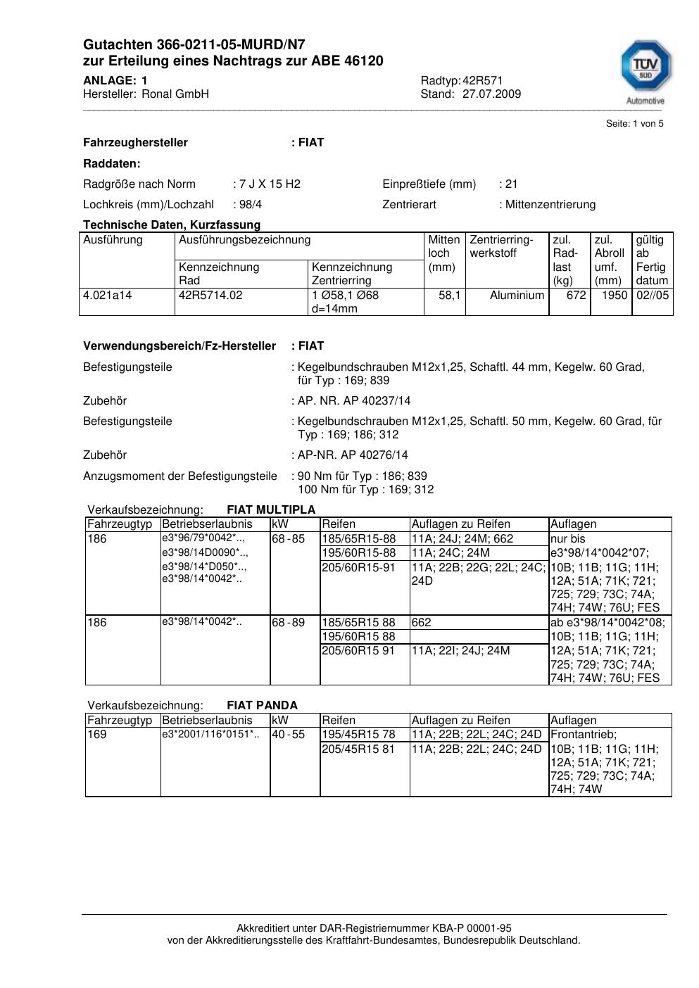 Dieses Gutachten (abe) bezieht sich auf die Alufelge Ronal 42R571 in der Ausführung 7Jx15 ET 0, Mittenloch 0 mm (KBA 46120). Im PDF findest du typischerweise zulässige Reifengrößen, Auflagen/Anbauhinweise und – je nach Dokument – Hinweise zur Eintragung.
