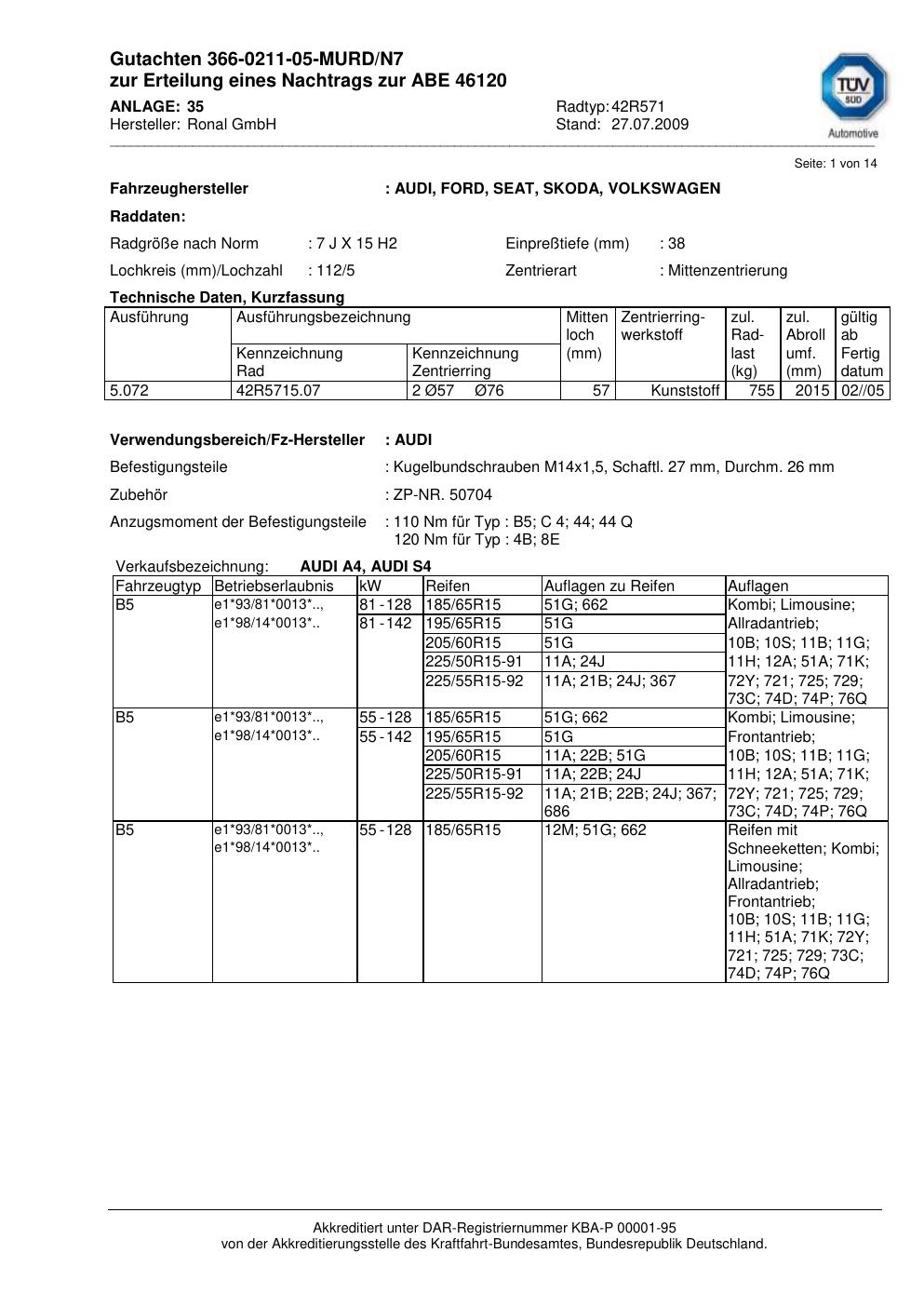 Dieses Gutachten (abe) bezieht sich auf die Alufelge Ronal 42R571 in der Ausführung 7Jx15 ET 0, Mittenloch 0 mm (KBA 46120). Im PDF findest du typischerweise zulässige Reifengrößen, Auflagen/Anbauhinweise und – je nach Dokument – Hinweise zur Eintragung.