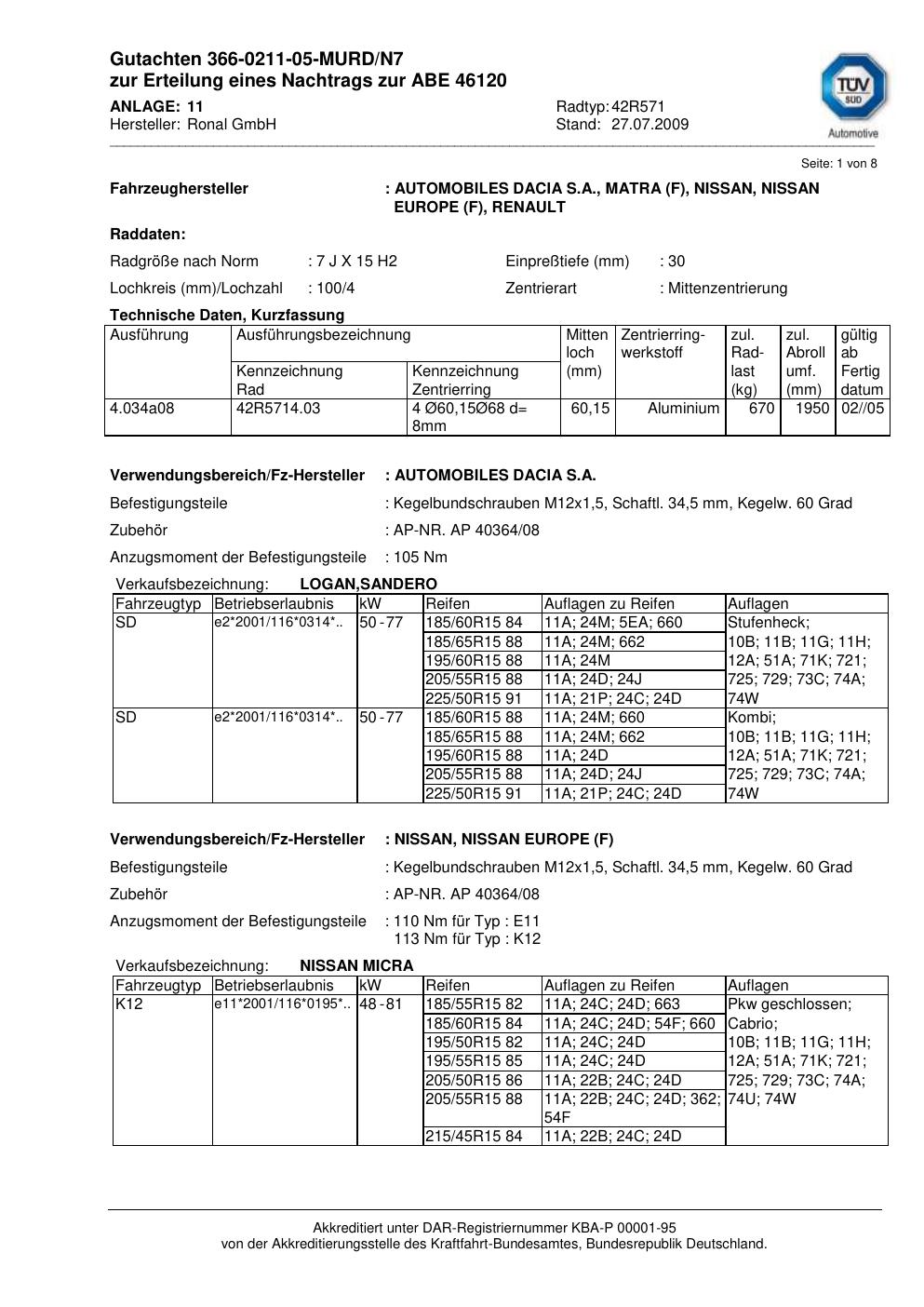 Dieses Gutachten (abe) bezieht sich auf die Alufelge Ronal 42R571 in der Ausführung 7Jx15 ET 0, Mittenloch 0 mm (KBA 46120). Im PDF findest du typischerweise zulässige Reifengrößen, Auflagen/Anbauhinweise und – je nach Dokument – Hinweise zur Eintragung.