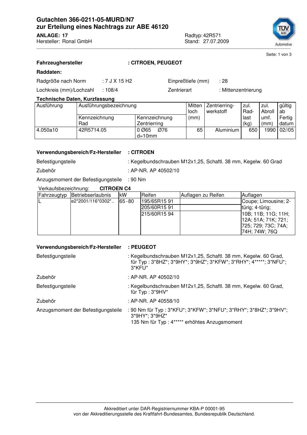 Dieses Gutachten (abe) bezieht sich auf die Alufelge Ronal 42R571 in der Ausführung 7Jx15 ET 0, Mittenloch 0 mm (KBA 46120). Im PDF findest du typischerweise zulässige Reifengrößen, Auflagen/Anbauhinweise und – je nach Dokument – Hinweise zur Eintragung.