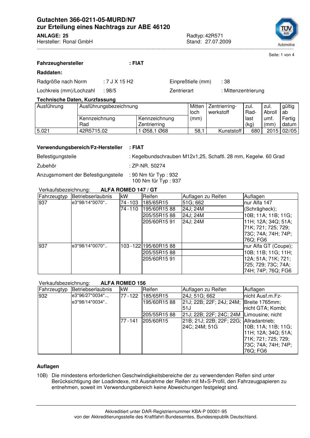 Dieses Gutachten (abe) bezieht sich auf die Alufelge Ronal 42R571 in der Ausführung 7Jx15 ET 0, Mittenloch 0 mm (KBA 46120). Im PDF findest du typischerweise zulässige Reifengrößen, Auflagen/Anbauhinweise und – je nach Dokument – Hinweise zur Eintragung.