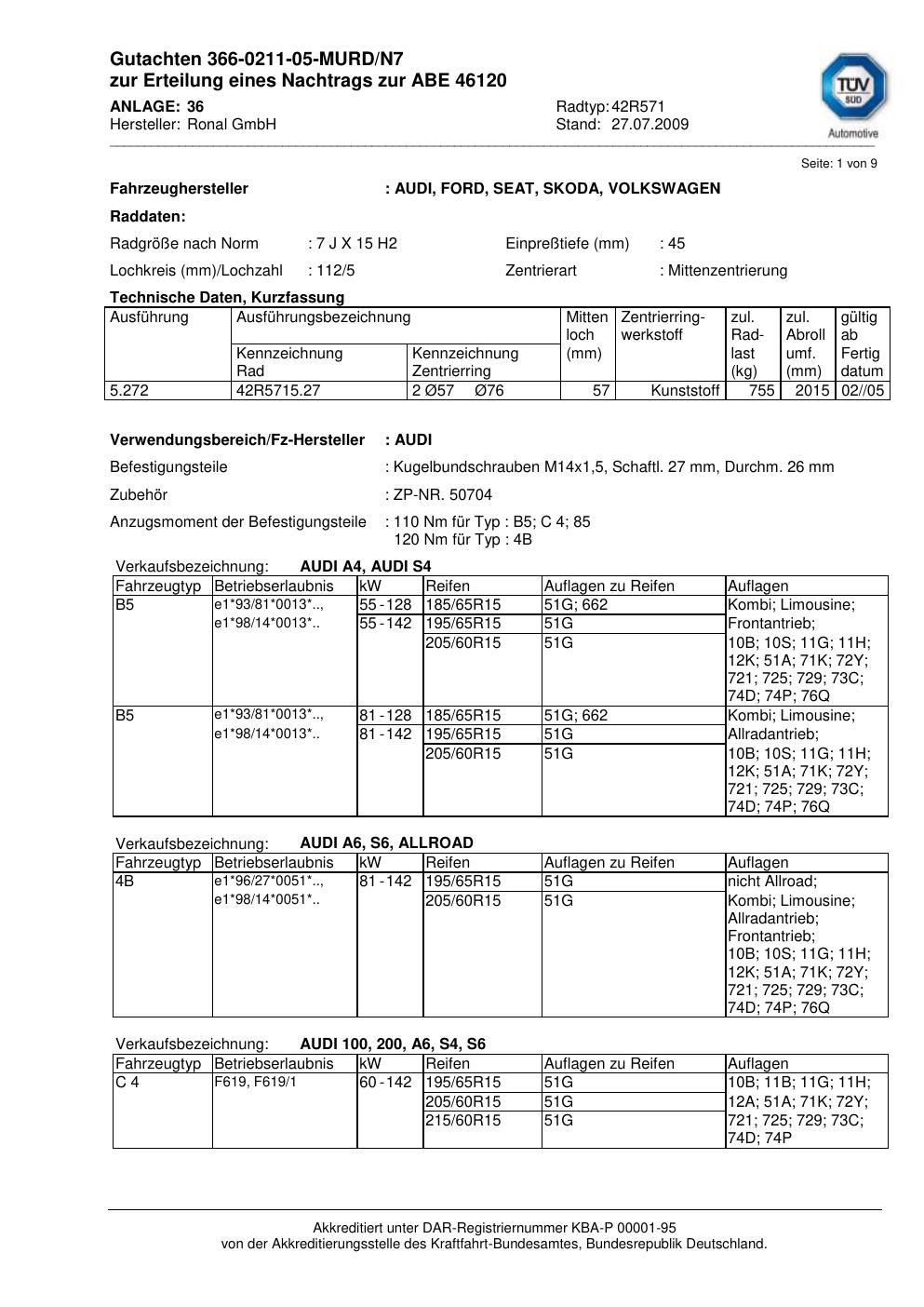 Dieses Gutachten (abe) bezieht sich auf die Alufelge Ronal 42R571 in der Ausführung 7Jx15 ET 0, Mittenloch 0 mm (KBA 46120). Im PDF findest du typischerweise zulässige Reifengrößen, Auflagen/Anbauhinweise und – je nach Dokument – Hinweise zur Eintragung.