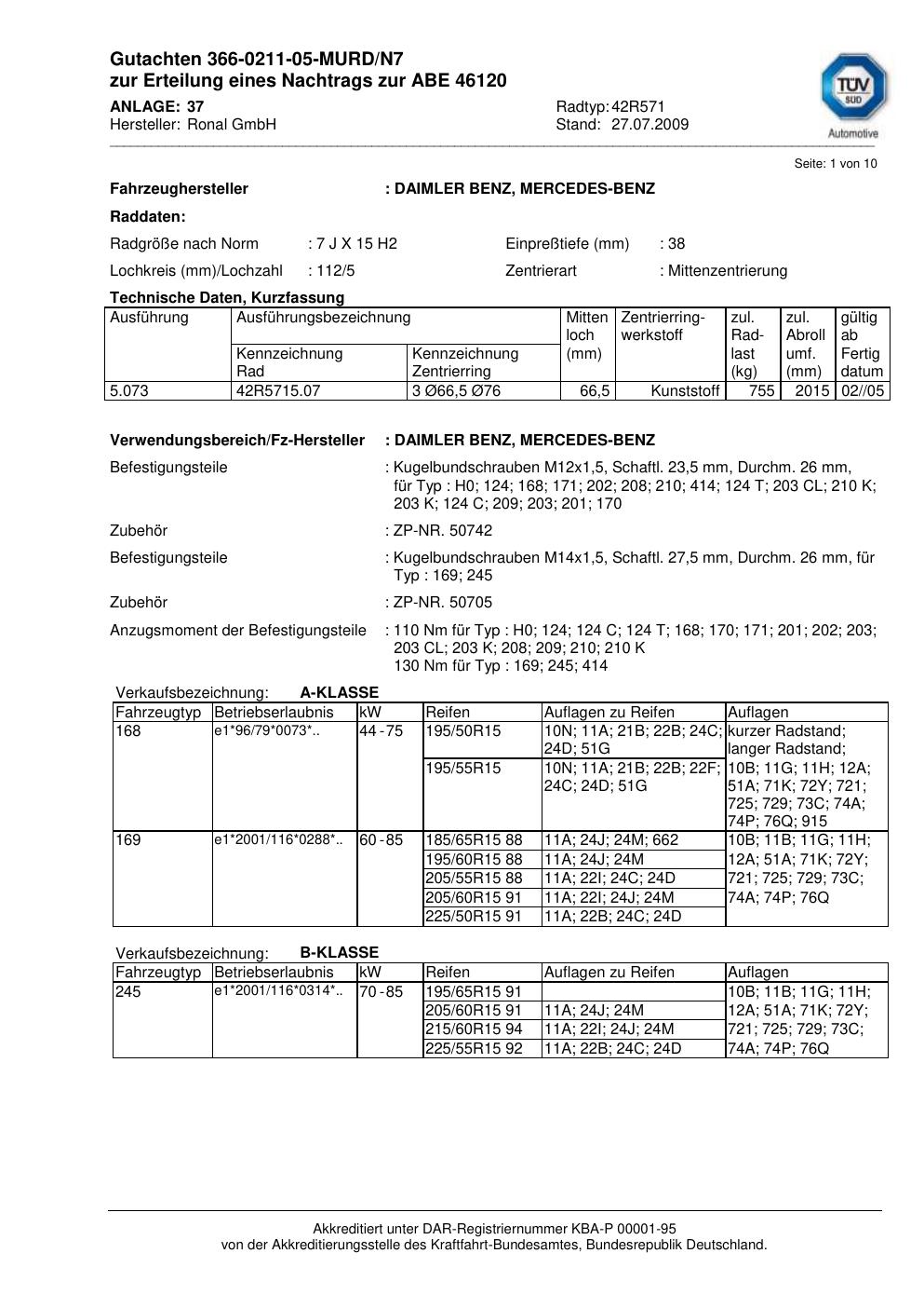 Dieses Gutachten (abe) bezieht sich auf die Alufelge Ronal 42R571 in der Ausführung 7Jx15 ET 0, Mittenloch 0 mm (KBA 46120). Im PDF findest du typischerweise zulässige Reifengrößen, Auflagen/Anbauhinweise und – je nach Dokument – Hinweise zur Eintragung.