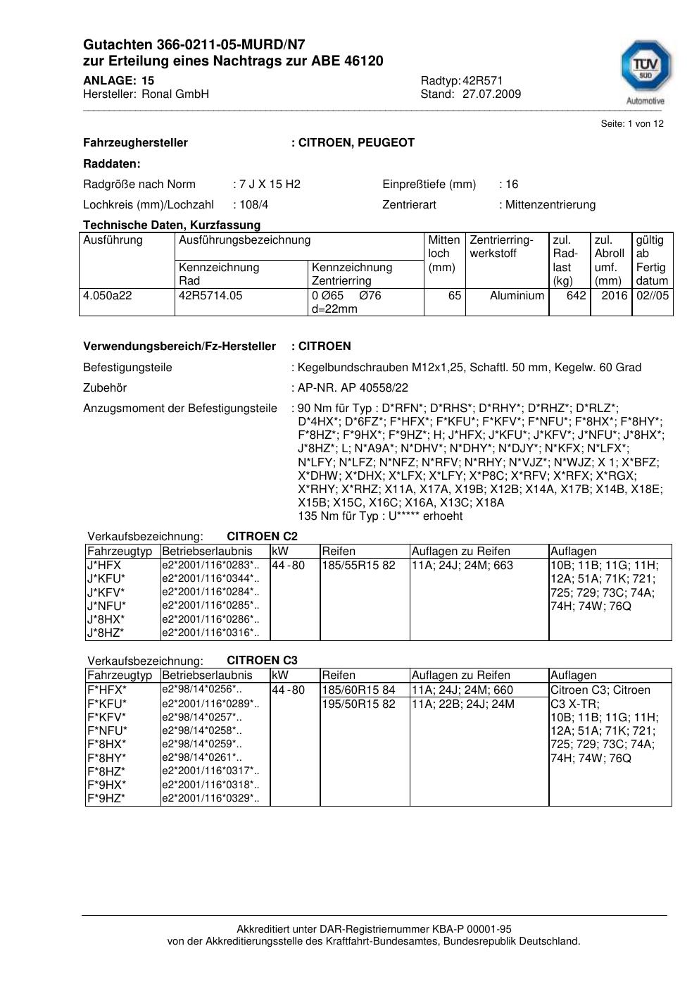 Dieses Gutachten (abe) bezieht sich auf die Alufelge Ronal 42R571 in der Ausführung 7Jx15 ET 0, Mittenloch 0 mm (KBA 46120). Im PDF findest du typischerweise zulässige Reifengrößen, Auflagen/Anbauhinweise und – je nach Dokument – Hinweise zur Eintragung.