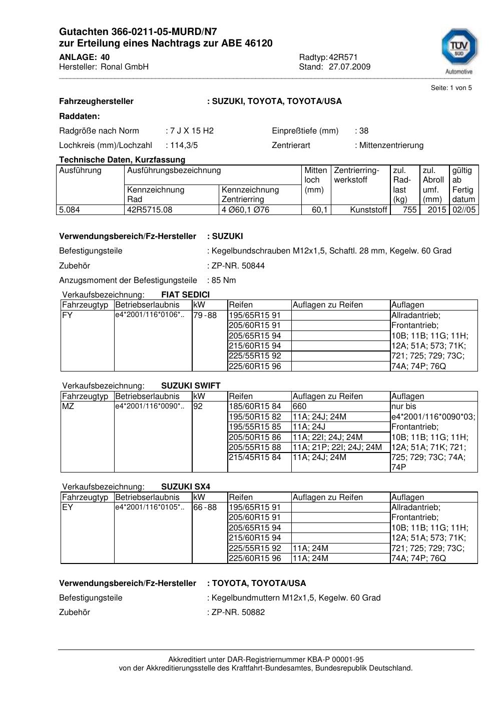 Dieses Gutachten (abe) bezieht sich auf die Alufelge Ronal 42R571 in der Ausführung 7Jx15 ET 0, Mittenloch 0 mm (KBA 46120). Im PDF findest du typischerweise zulässige Reifengrößen, Auflagen/Anbauhinweise und – je nach Dokument – Hinweise zur Eintragung.