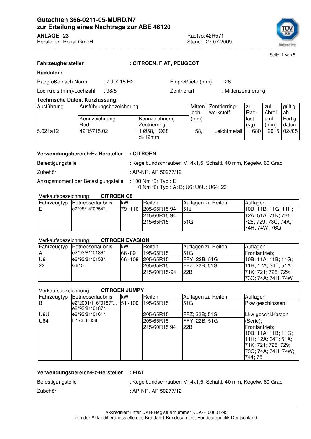 Dieses Gutachten (abe) bezieht sich auf die Alufelge Ronal 42R571 in der Ausführung 7Jx15 ET 0, Mittenloch 0 mm (KBA 46120). Im PDF findest du typischerweise zulässige Reifengrößen, Auflagen/Anbauhinweise und – je nach Dokument – Hinweise zur Eintragung.